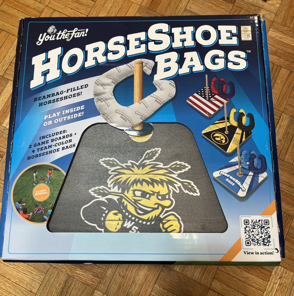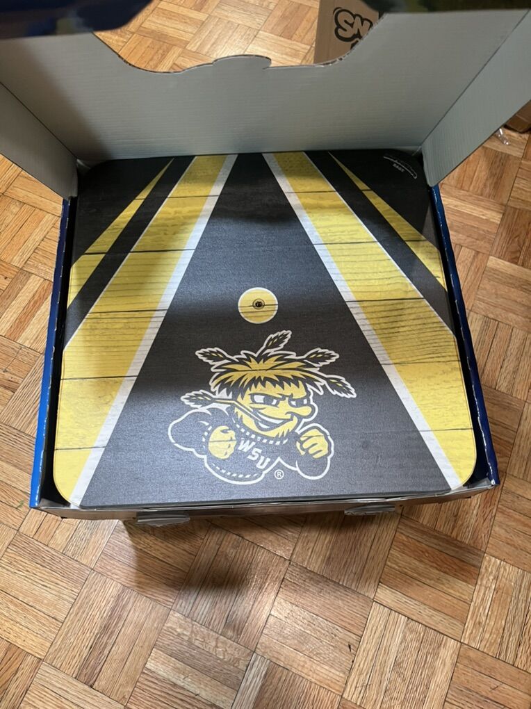 VenmoBrand new in box. Opened it up for photos. Horseshoe bean bag game with college team of Wichita state shockers. It has in it 4 bags, two boards and a carrying case for everything. Bags are all weather fabric filled with resin beads