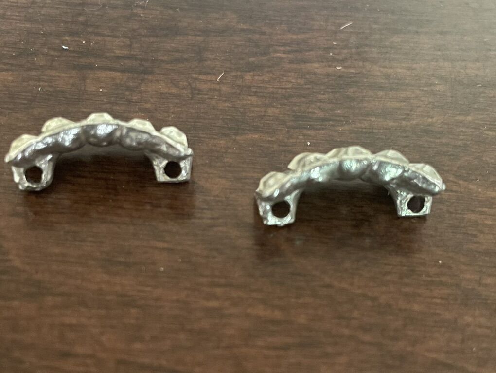 I have 2 vintage pieces that each have 5 emerald cut rhinestones. They are set in silver tone metal but I don’t see any maker’s marks or metal content markings so I don’t know what the metal actually is. I’m not sure what they were for. There are 2 metal hoops on the back. I’m hoping someone can find a use for them. They are 7/8 inches long. The price is for both of them together. See my other ads for jewelry, artwork, home decor and more.