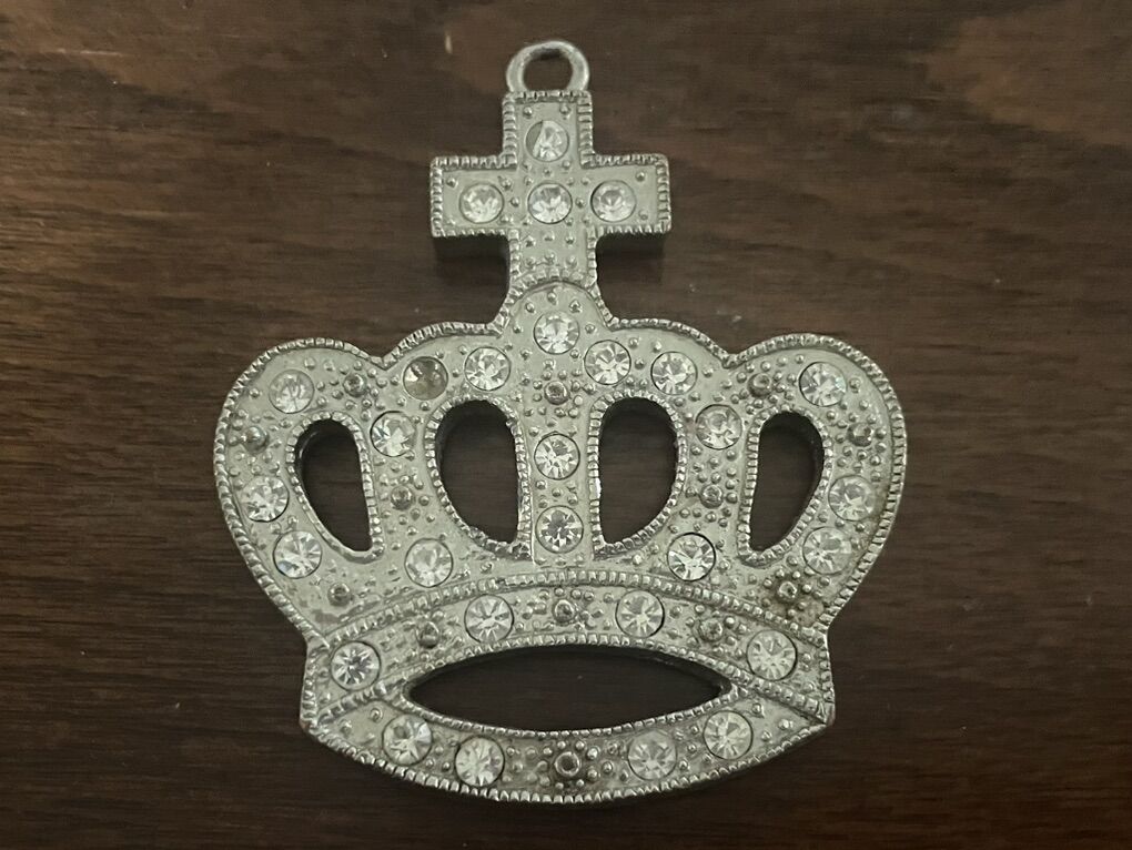 I have a big silver tone crown pendant with a cross on the top. It is covered with rhinestones on both sides. There is 1 rhinestone missing on one side and 3 missing on the other side. It is 2 5/8 inches tall and just over 2 1/4 inches wide. I don’t see any maker’s mark or metal content markings so I don’t know what the metal actually is. See my other ads for jewelry, artwork, home decor and more.