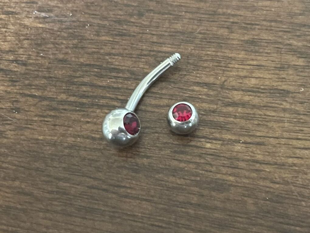 I have a belly button ring for a naval piercing. It is silver tone with round dark red stones (like a garnet). I don’t see a maker’s mark or metal content markings so I don’t know what the metal actually is. See my other ads for jewelry, artwork, home decor and more.