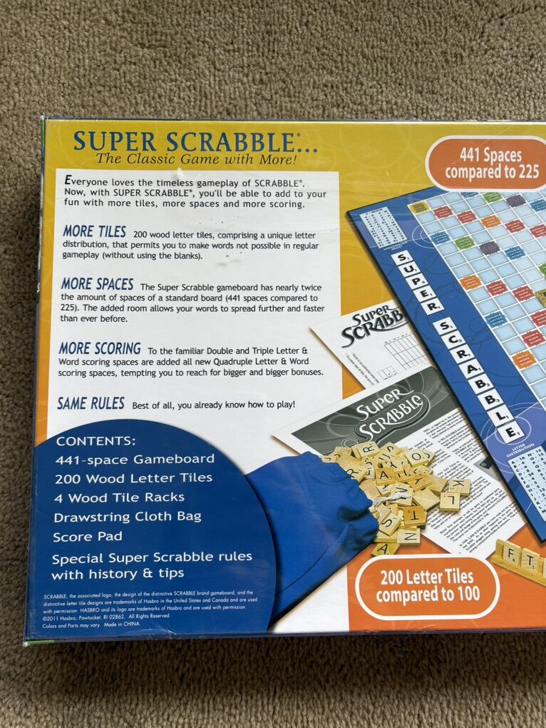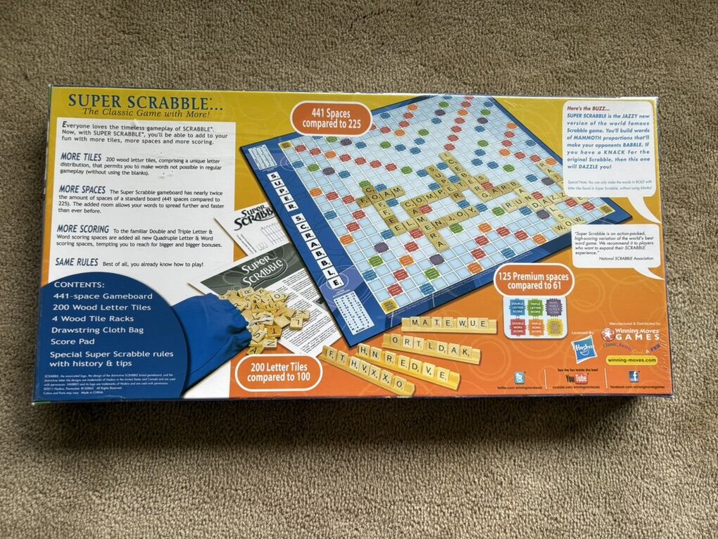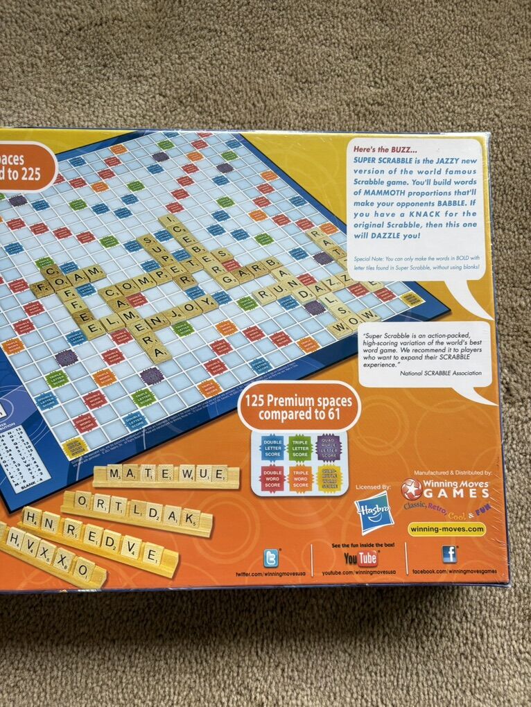 NEW (sealed in plastic) Super Scrabble Board Game: More spaces, more tiles, more points—add to your fun! Every word’s a winner. Ages 8 +, 2-4 players. Hasbro, Winning Moves Games, 2011. New, unopened condition. Text only. Cash or Venmo.