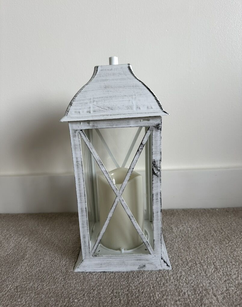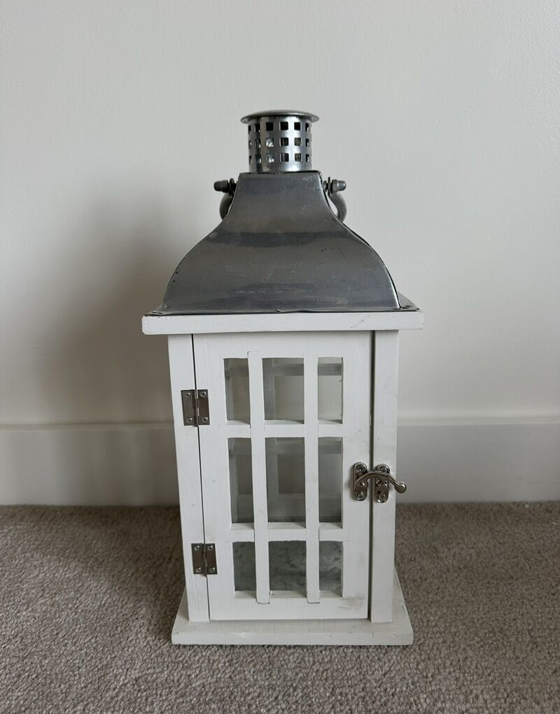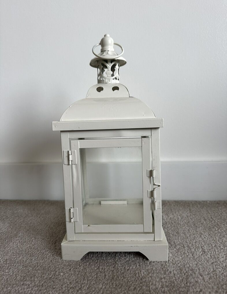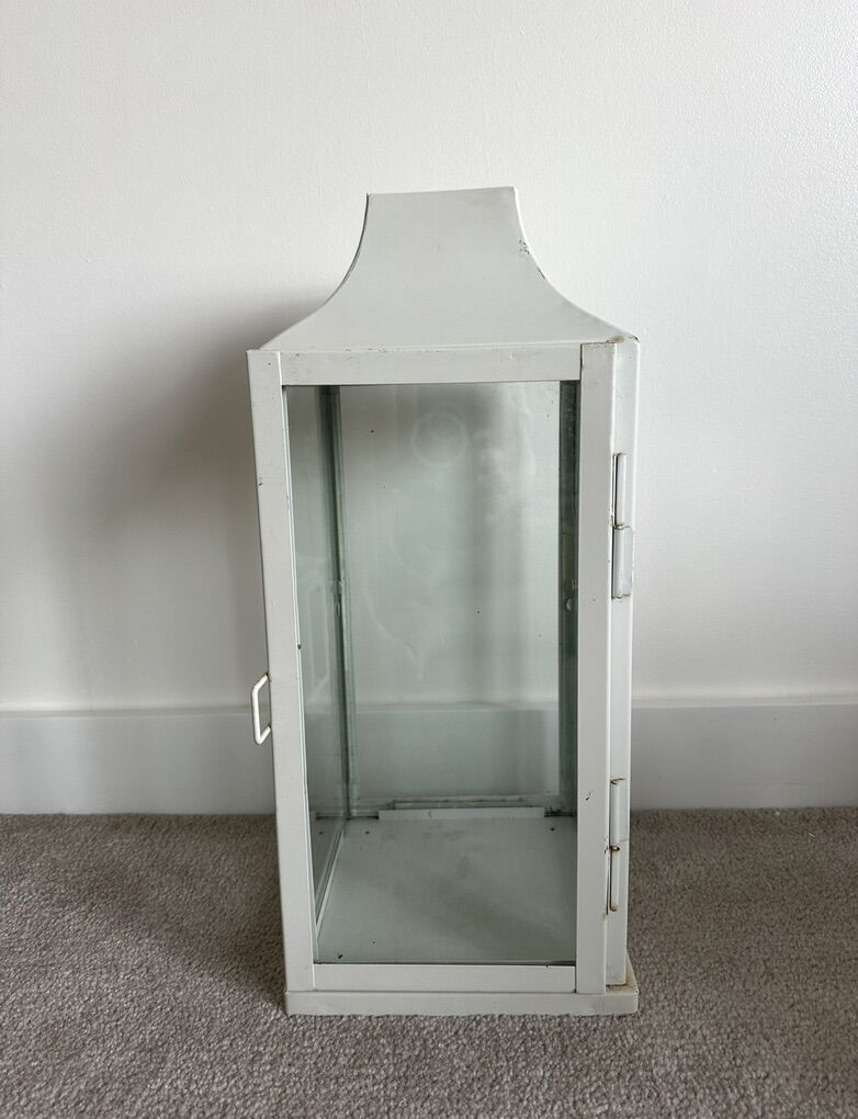 Individual Pictures Shown are available. Tall Glass Lantern 18” Tall $22 Tall Wood / Silver gray Tin on top Lantern 21.5 Tall. $22 Grayish / Black X front Lantern 11” Tall $12 Ivory Lantern about 13” Tall $14 Octagon about 9” Tall $8 Birdcage 10” W x 7” D x 12 “ T $16