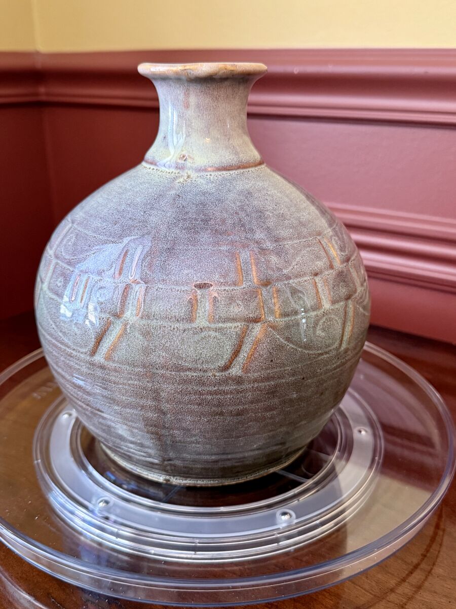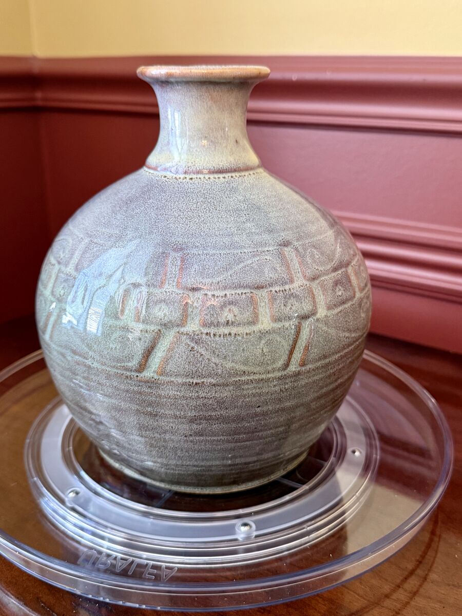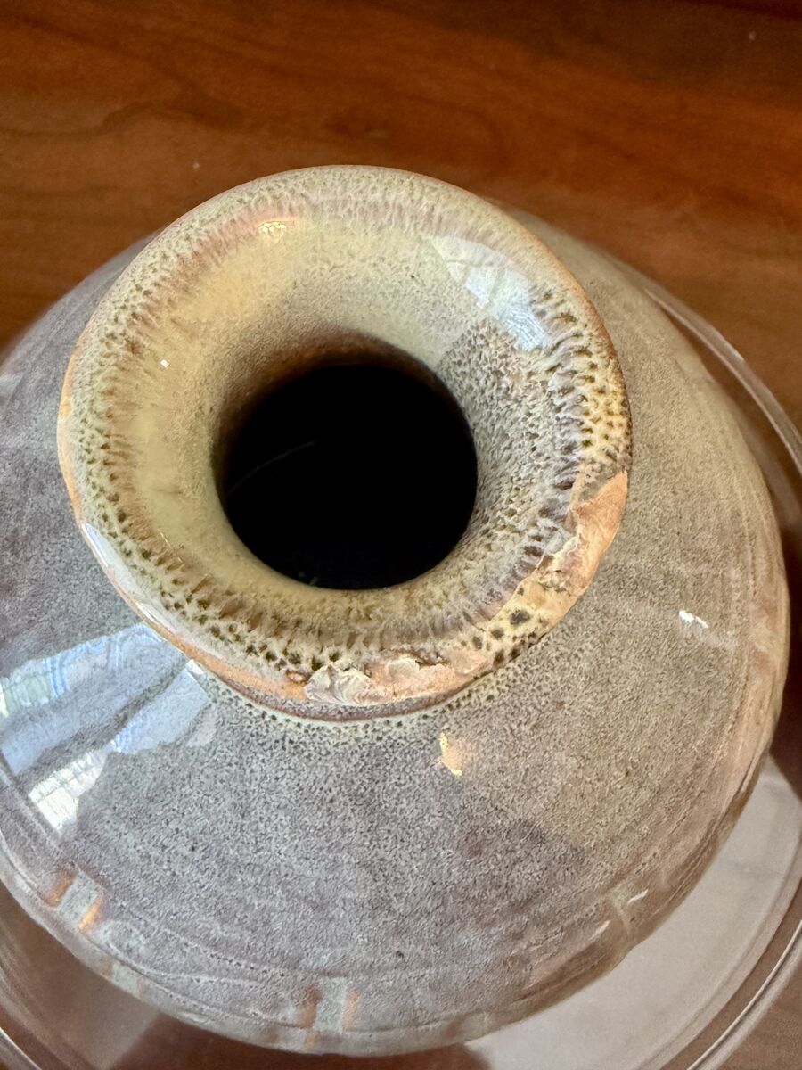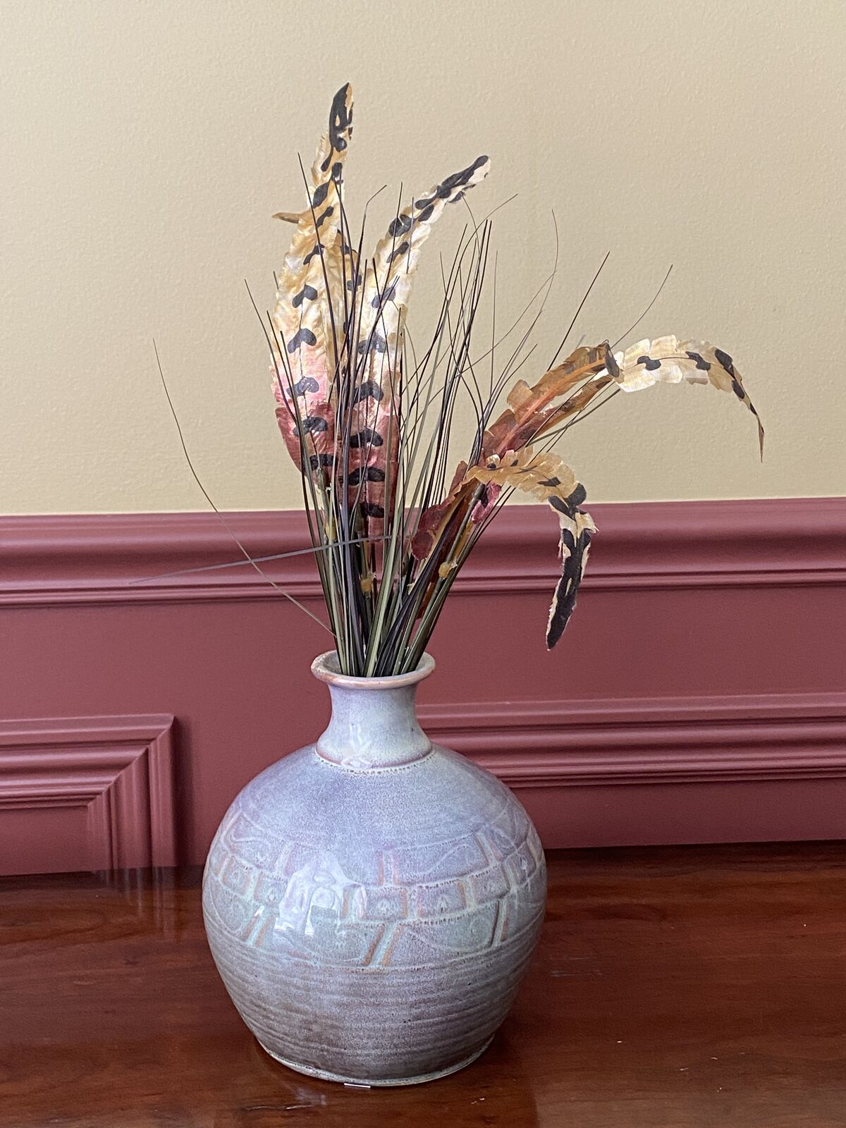 LIKE NEW - Handcrafted Pottery w/ Impressed Pattern and A Narrow Neck - Beautiful Glaze - C PIX. Measures approximately 8 inches Tall and 6 inches Wide. Would look great with some petite grass or eucalyptus coming out of the neck or left to shine on its own. It also has very nice rubber protectors on the bottom to protect your surface. Want the feather picks, just add $4 they are brand new.