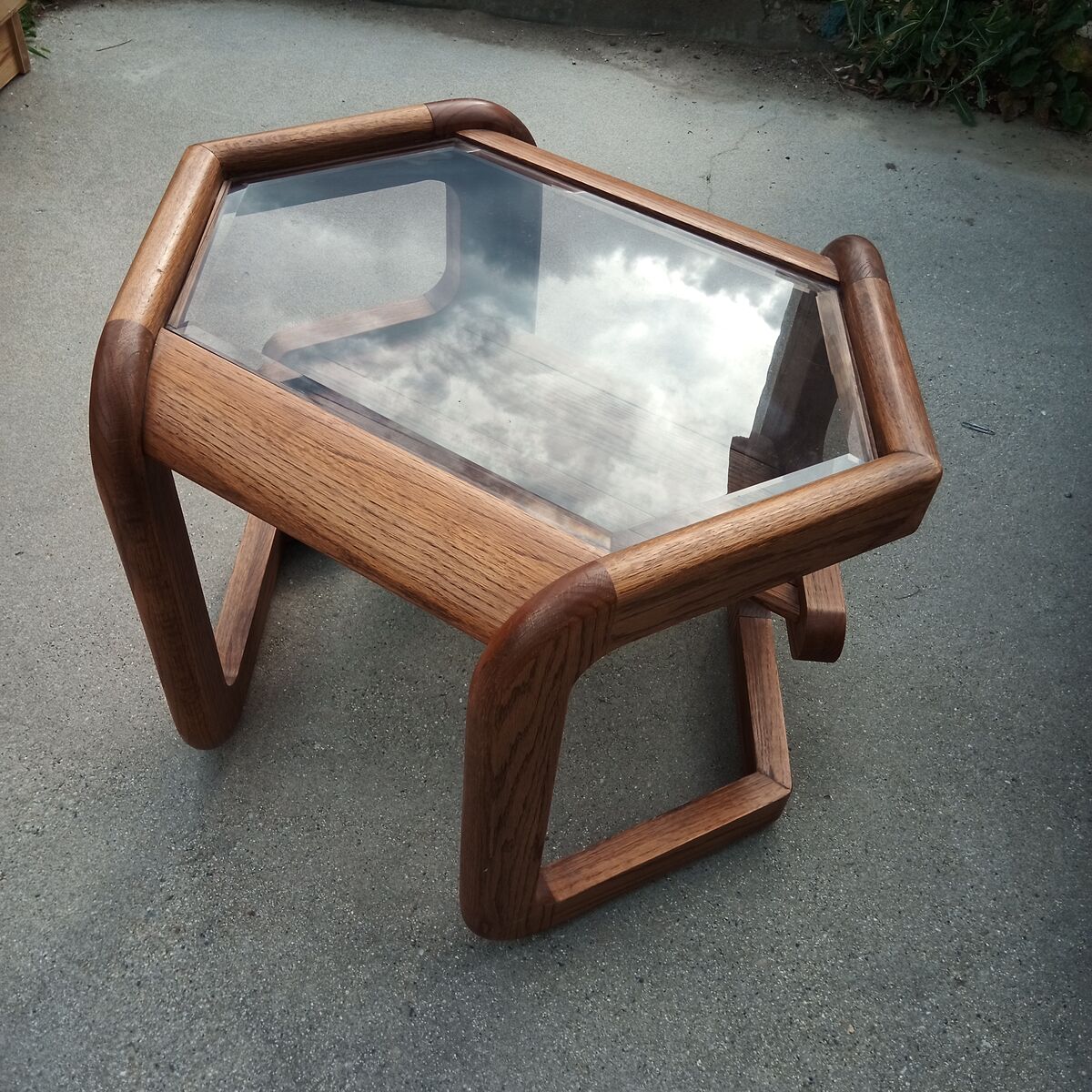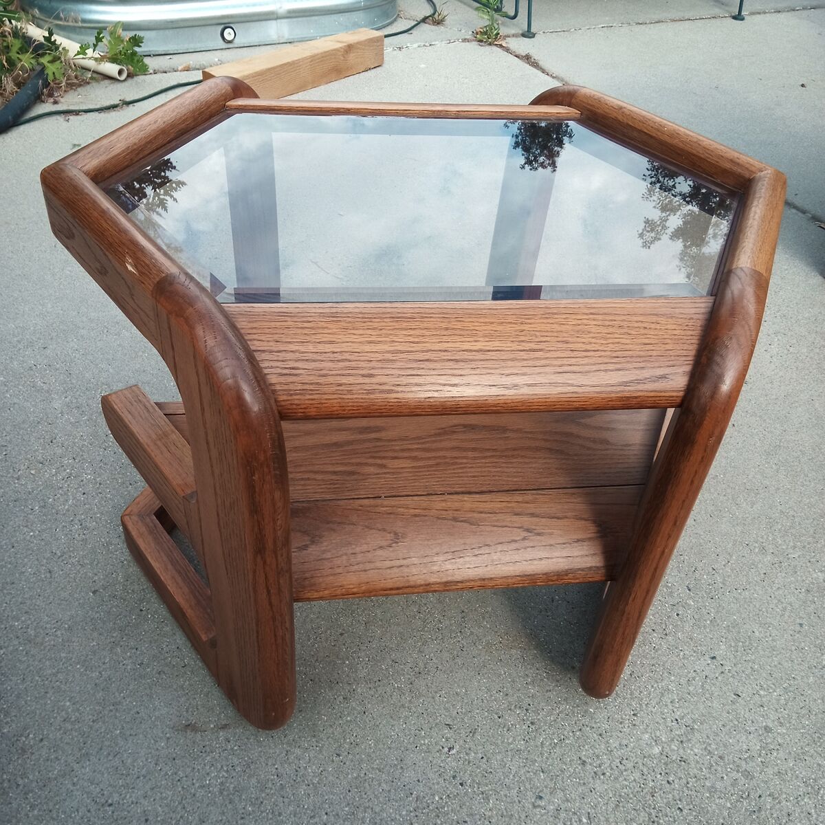 Hexagonal mid century side table in oak and smoked glass.
