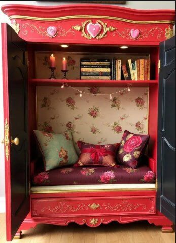 Create the perfect space to read your favorite romance authors, daydream about your own juicy novel, store your most beloved books, and add to your home's Romantic Hearts Valentine's Day-loving aesthetic! We can create custom paint colors to suit your preferences, fabric patterns and colors for your bench cushion, shelving options, and decoupage images as you'd like. This will be an heirloom piece to cherish for generations. These reading nooks are suitable for kids and adults, and we work locally to source just the right antique armoire dresser for your home. We look forward to designing your Romantic Hearts-themed reading nook space!