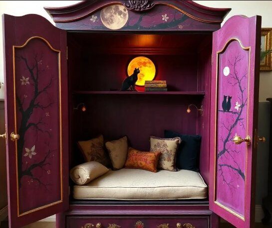 Create the perfect space to read your favorite witchy authors, daydream about your own novel, store your most beloved books, and add to your home's soothing witchy cat moon-loving aesthetic! We can create custom paint colors to suit your preferences, fabric patterns and colors for your bench cushion, shelving options, and decoupage images as you'd like. This will be an heirloom piece to cherish for generations. These reading nooks are suitable for kids and adults, and we work locally to source just the right antique armoire dresser for your home. We look forward to designing your witchy cat moon-themed reading nook space!