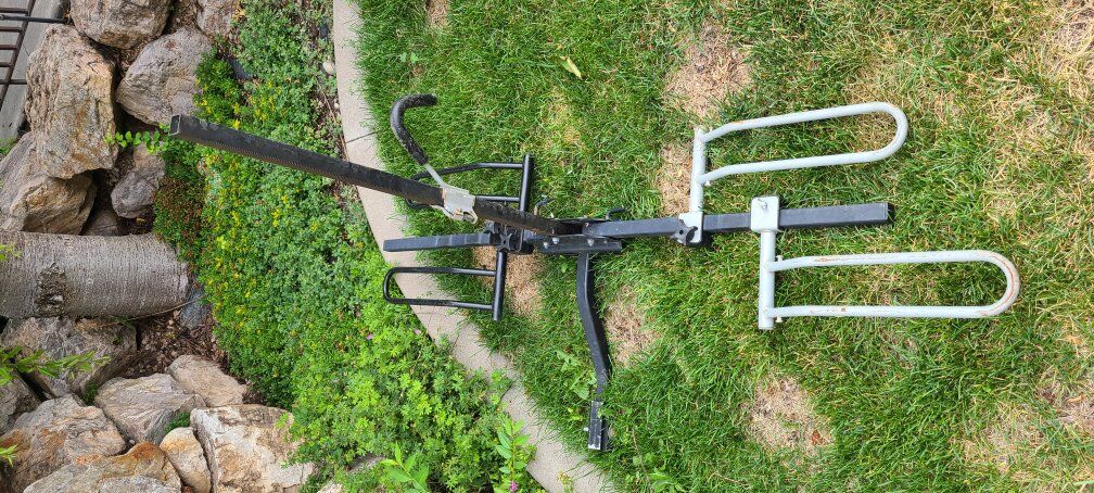 hitch mount, holds 2 bikes. folds up for easy storage, and is out of the way for tailgate or rear trunk door.