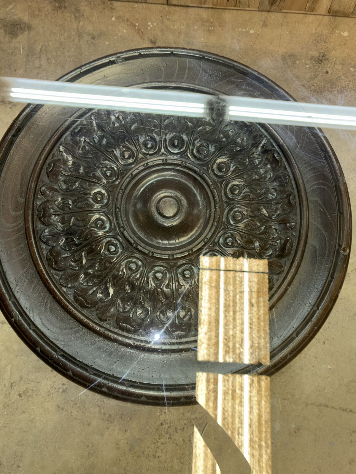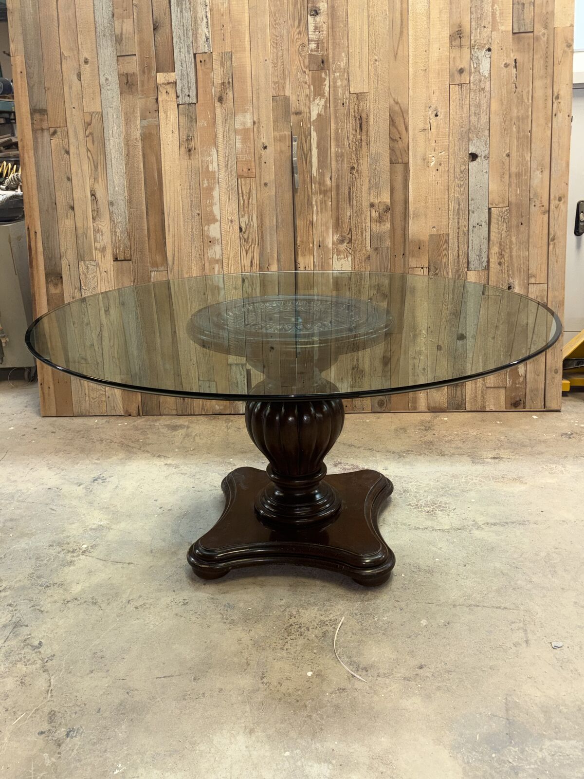VenmoGlass table with a solid wood base, measuring 5 feet across and 30 inches tall. The thick glass top has some minor surface scratches from normal use. Wood base is in excellent condition. Asking $600 but open to offers.