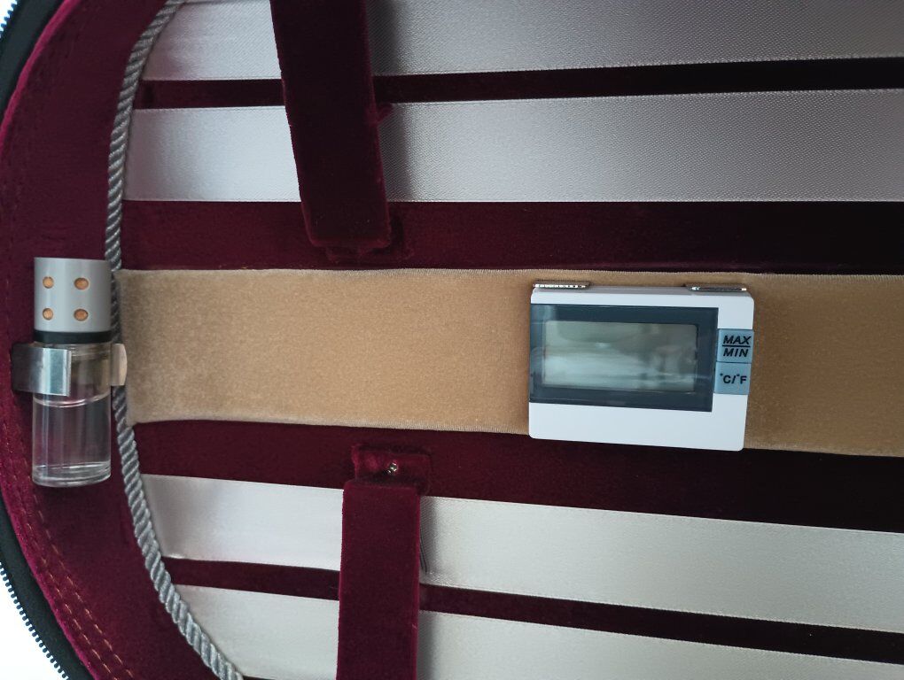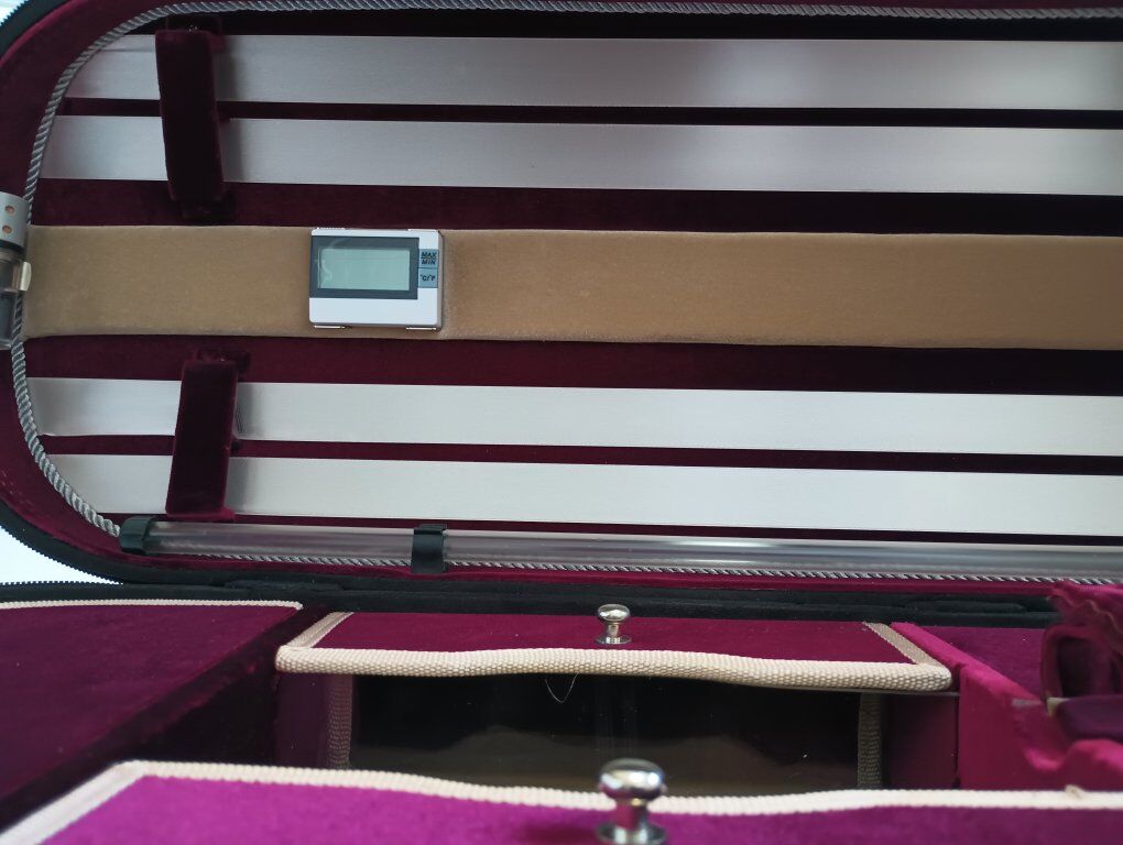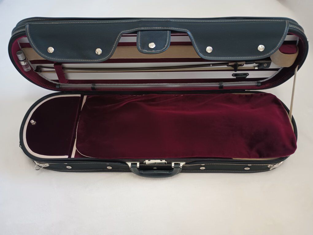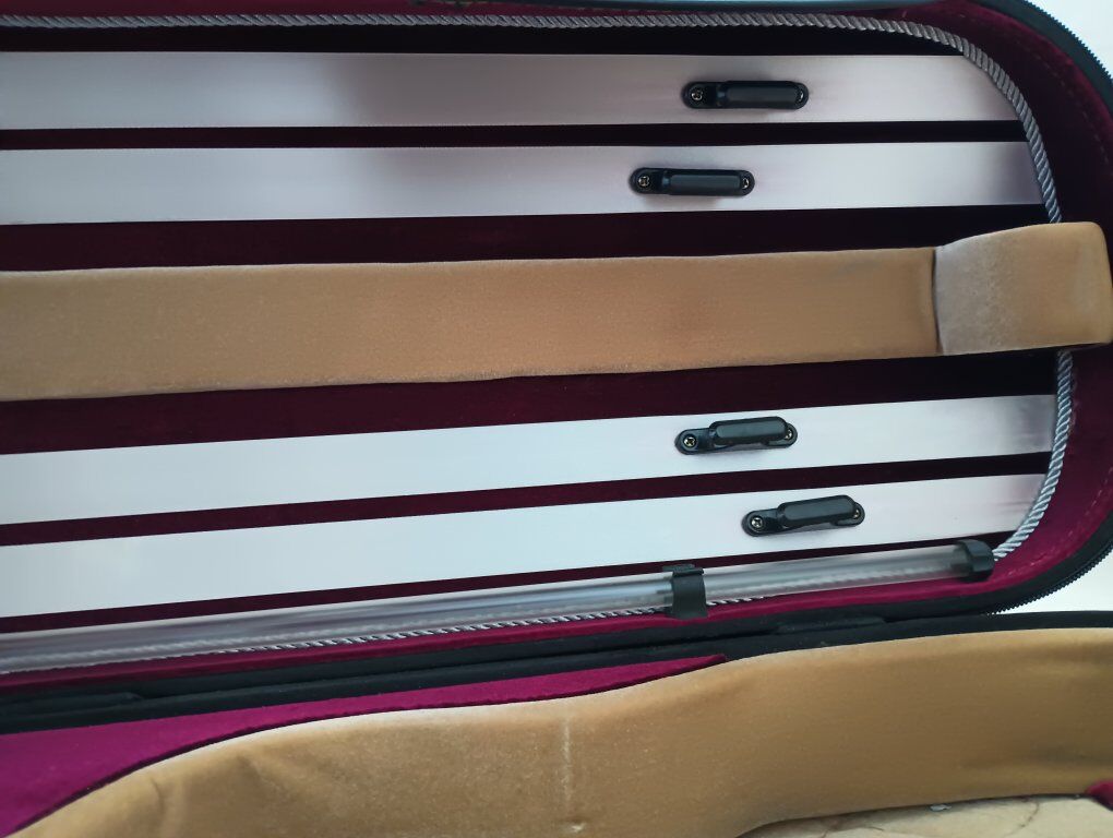 Suspension Violin Case with Four Bow Holders, Hygrometer, and Humidifier; Quilted Trim, Rope Accents, Three Interior Pockets