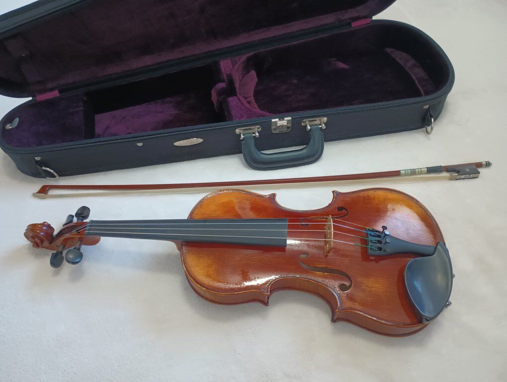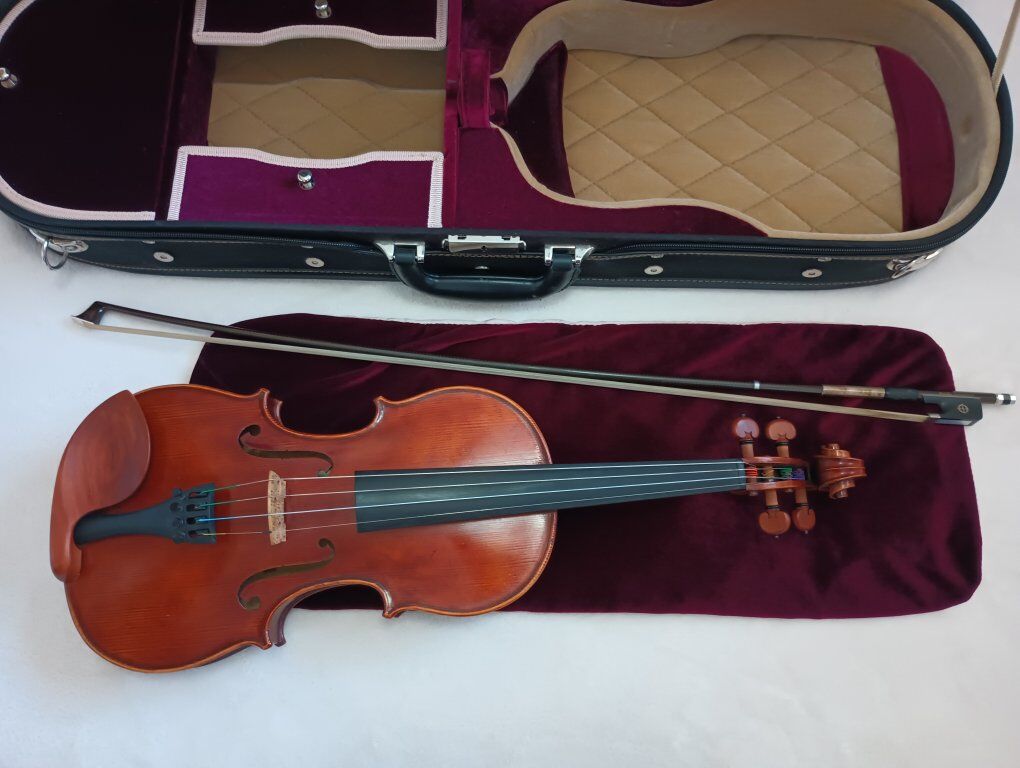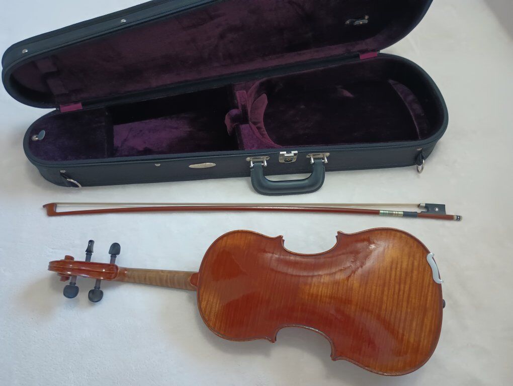 Full-sized violins, bows, and cases. Violins have new strings and were recently serviced by a professional shop. Violins made of spruce and maple. Hand-made. Good condition. Intermediate level. Well-maintained and kept in a humidity controlled environment. Includes hard case and bow.