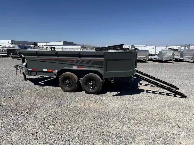 Stock #: RM1529 Trailer Specs: Color: Shadow Grey Powdercoat Overall: Length: 19'0" Width: 8'6" Interior/Bed: Length: 14' Width: 7' Side Height: 32" Weight: 4,916 lbs. | GVWR: 14,000 lbs. | Payload: 9,084 lbs. Axle(s): 7,000 lb. Dexter Spring Braked Axle w/ EZ Lube Hubs Tire/Wheel: ST235/80R16 | Load Range E Coupler: Type: Bumper Pull | Size 2 5/16" | 7-Way 12V Connector 8"x13lb I-Beam Main Frame | 3" Channel Cross-Members | 16" OC 5 Year Dexter Axle Warranty 3 Year Structural Warranty 1 Year Limited Warranty Standard Features: 7 Cubic Yard Capacity 12G Steel Side Walls w/ Reinforced Rails 8G Steel Floor Plate (4) Welded D-Rings Power Up/Down KTI Hydraulic Pump 5" Hydraulic Cylinder w/ Scissor Lift Rear Barn & Spreader Gate 10K Drop Leg Jack Safety Chains All-Weather Wiring Harness Breakaway System w/ Charger LED DOT Approved Lights Powdercoated WASATCH TRAILER SALES - LARGEST TRAILER SELECTION IN UTAH Springville: (801) 528-1581 | 1180 S 2000 W, Springville UT, 84663 View More Inventory: www.wasatchtrailer.com
