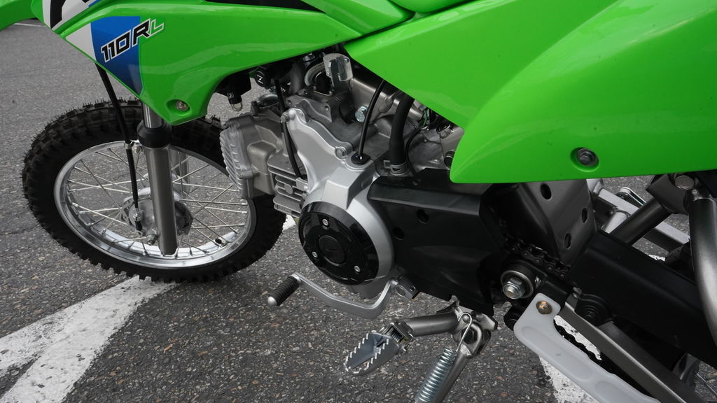 KLX®110R motorcycles are powered by a 112cc air-cooled 4-stroke engine. The KLX110R features a 4-speed transmission with automatic clutch while the KLX®110R L offers a manual clutch to learn big bike shifting techniques.