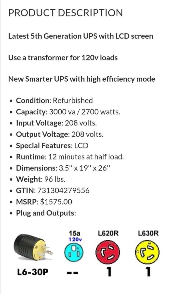 Manufacturer: APC Model: APC Smart-UPS 3000VA 2700W RM 2U 208V Condition: New batteries, refurbished UPS Part Number: SMT3000RMT2U Maximum output: 2700W / 3000VA Typical backup time at half load: 12 minutes (1350 Watts) Typical backup time at full load: 3 minutes (2700 Watts)