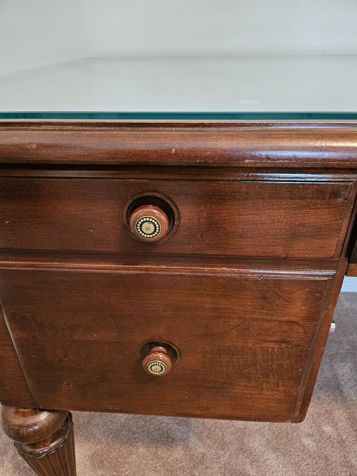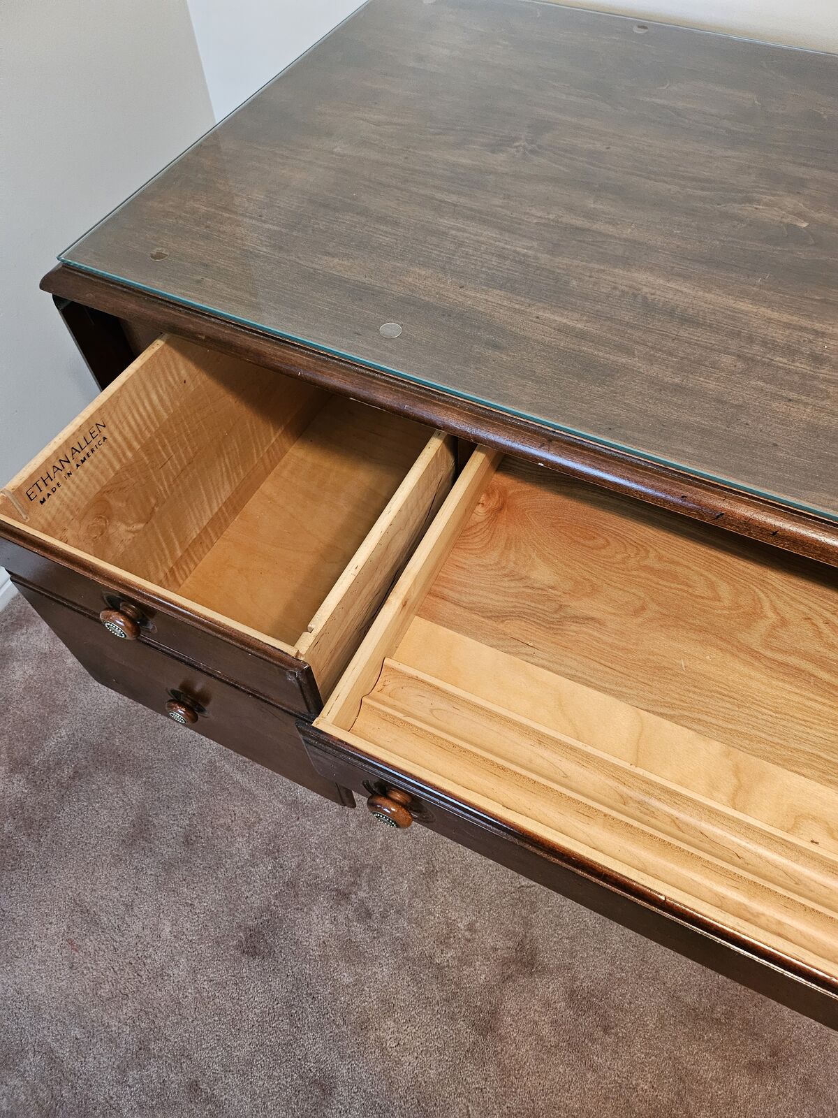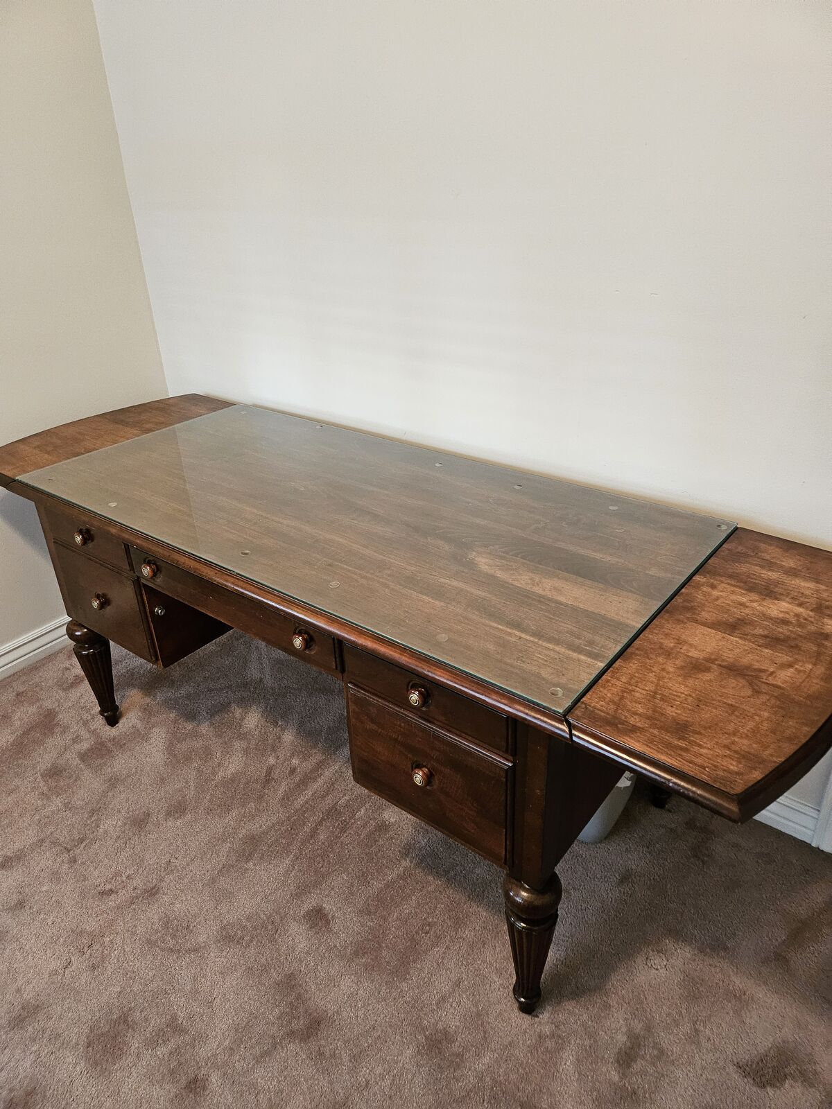 VenmoSolid wood executive desk from Ethan Allen. Walnut finish with a slight tint of cherry Sturdy and strong drop leaf design Measures 60/72/83 in width (depending on leaf extension); 29 in depth; 30 in height Temperd glass top for added protection.