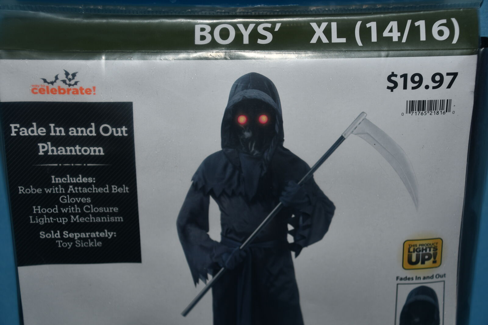 This NIP BOYS "FADE IN & OUT PHANTOM" HALLOWEEN COSTUME is size XL (14-16). IT LIGHTS UP! Our home is smoke free. Questions??? Please ask. We are located in Plain City. Cash only please.