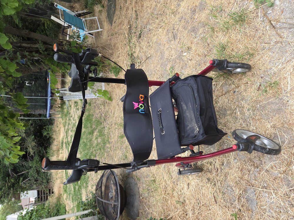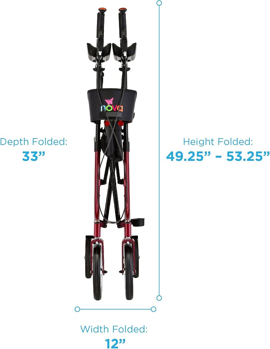 About this item Phoenix Rise UP Rollator gives your body the mobility partner to Rise Up & Look Forward. The unique design makes walking happen … with an upright forward looking posture, optimum control and stability and much reduced body strain and fatigue. And, when walking happens … you can Rise Up & Look Forward to just about anything. CONTOURED & PADDED ADJUSTABLE FOREARM CUFFS keep forearms secure and comfortable. They are adjustable to give the perfect fit and feel - and also very durable and easy to clean. Comes with NOVA’s Easy to Use Locking Hand Bakes. The Extra-wide backrest with light padding makes sitting safe and comfortably. Seat handles provide support to sit and stand. Comes with both a front pouch with zipper closure and cane / umbrella holder. ACHIEVE A NATURAL WALKING GAIT with the 32” clearance from the step to the back of the seat and 18.75” between the frame. This open area allows the user to have a natural walking gait without hitting the back of the seat. FOLDABLE, LIGHTWEIGHT & EASY TO TRANSPORT with a foldable design, handles that are easy to adjust to lowest setting (to make it more compact) with just one click (vs. multiple clicks) and weights only 20 lbs. making it easy to lift, carry and store. The Phoenix Rise UP Rollator has an approximate user height of 5’2” - 6’0” and has a 300 lb. weight capacity. LARGE 10” & 8” ALL TERRAIN WHEELS & SUPER STABLE FRAME make the Phoenix Rise UP Rollator great for indoor and outdoor use, and great on various and uneven surfaces. The front frame & wheels have an extended forward design so the user has optimal security & safety when going over door thresholds, cracks in the pavement or grassy terrain.