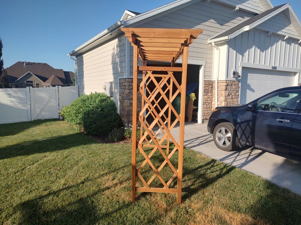 VenmoNew, Already Assembled. Cedar Heartwood Arbor Large. 7 feet wide, 7 feet 4 inches tall. beautiful Arbor that will add amazing look to your house to stand out from all the rest. Paid $500. Asking $300 and I have the quick concrete bags for installation you can have for free. First come first serve. text is best.