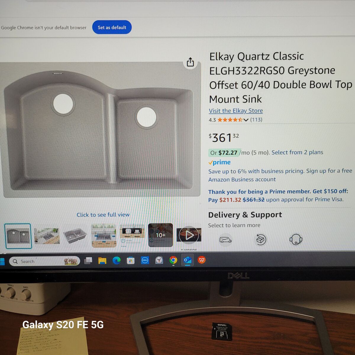 Elkay Quartz classic w/Aqua divide sink. Model number ELGHU332RGRO. Graystone color. 22"D x 33"W x 10"H. No damage. New in box. Retal $364. Selling for $140 Message me. CASH ONLY