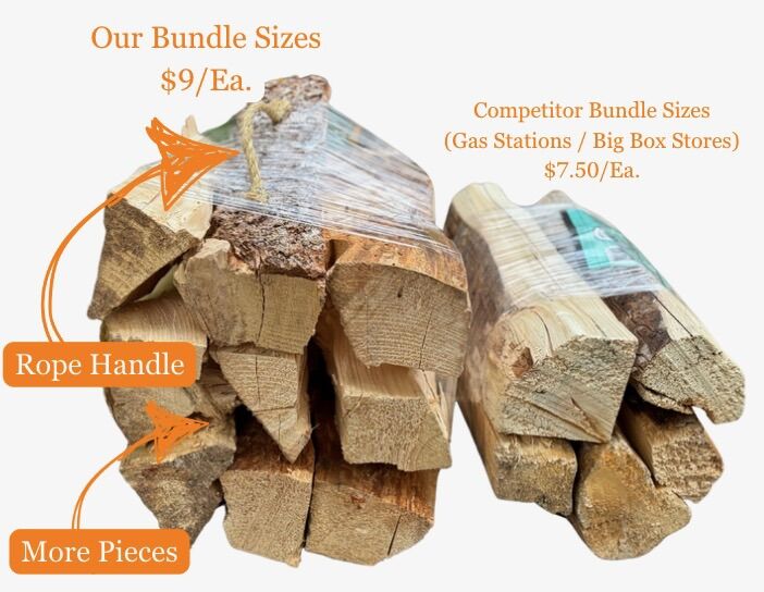 9 or more bundles = $8 per bundle. Approx. size of each bundle: 13”x13”x16”-18” (larger than any bundles you’ll find at a gas station or big box store)