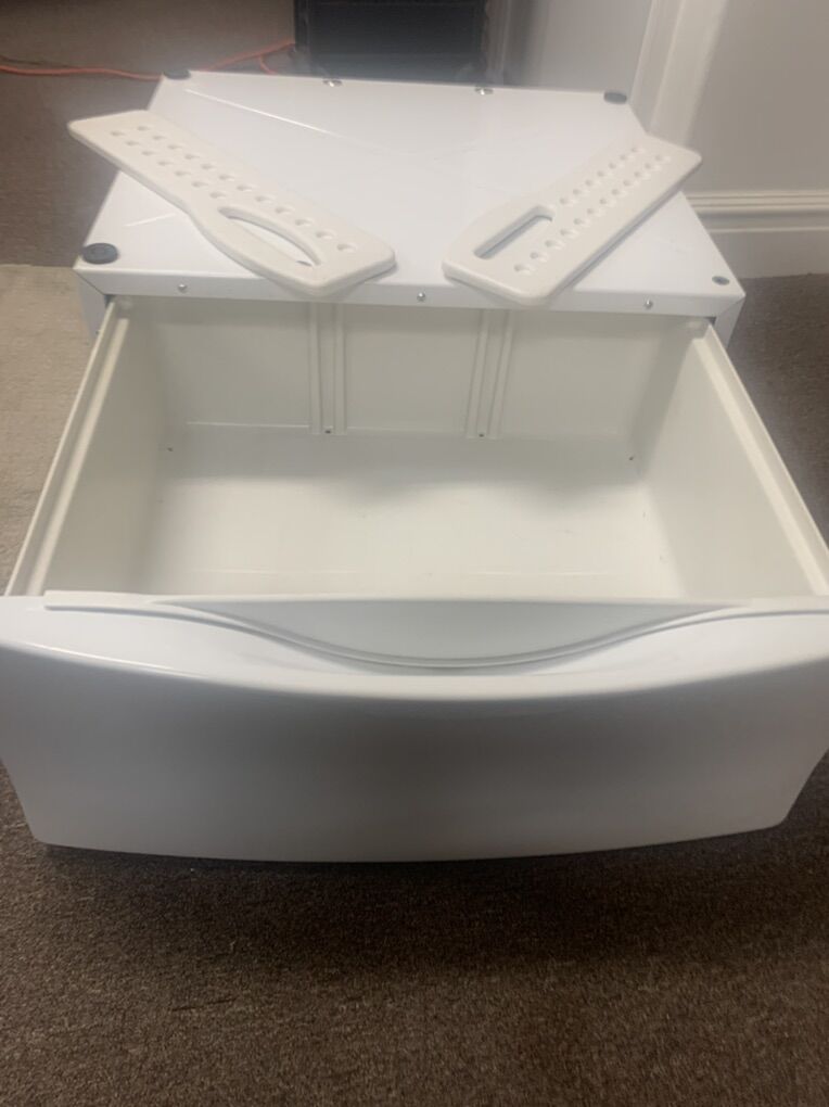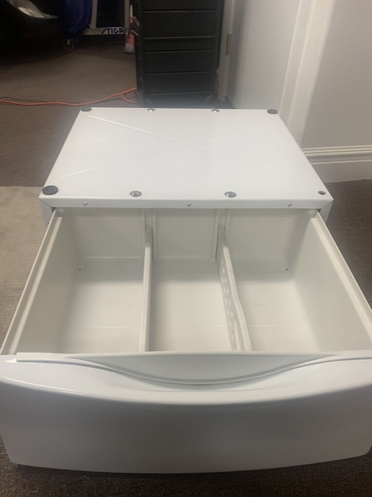 VenmoWhite Kenmore elite Pedestal. 27 inches wide by 24 1/2 inch long by 12 inches deep. Has storage drawer with removable dividers.! Works on both washers and dryers. Excellent condition. $79.