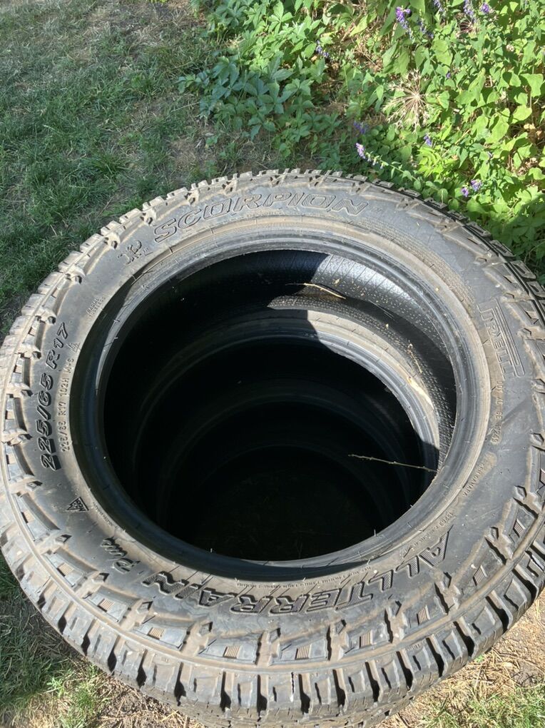 225/65/17R pirrelli scorpion all terrain R all season tires. Around 1000 miles on them, literally a new set of 4 tires that were $200 apiece and with fees an taxes over $900 . Basically a new set of pirrelli’s for $450 This is a my loss is Your gain situation. Come get them. Thanks for looking.