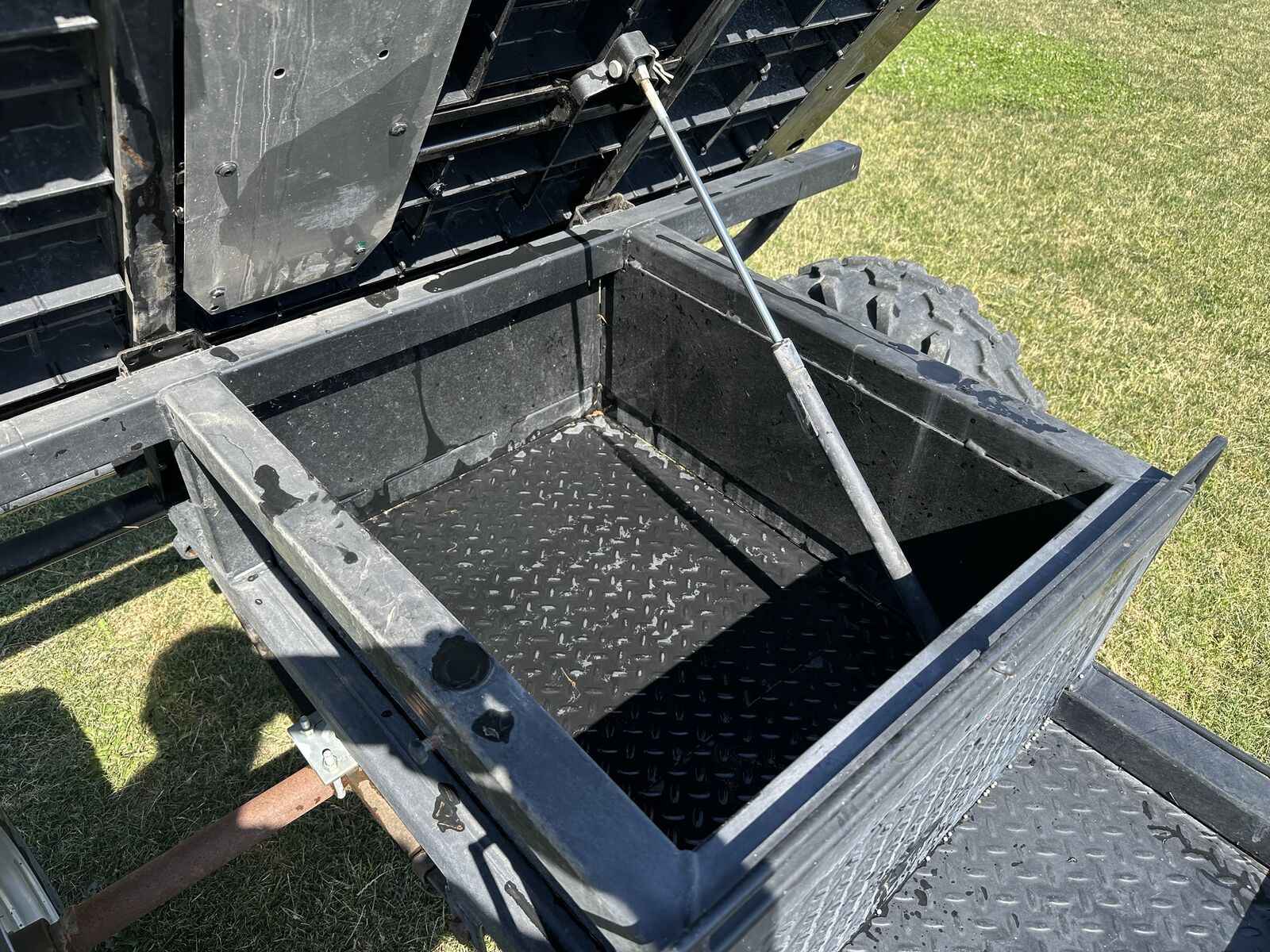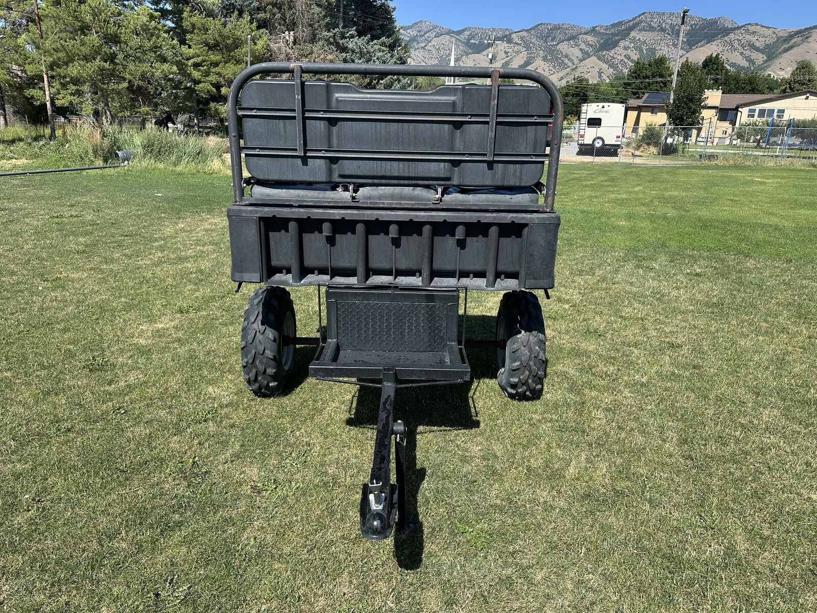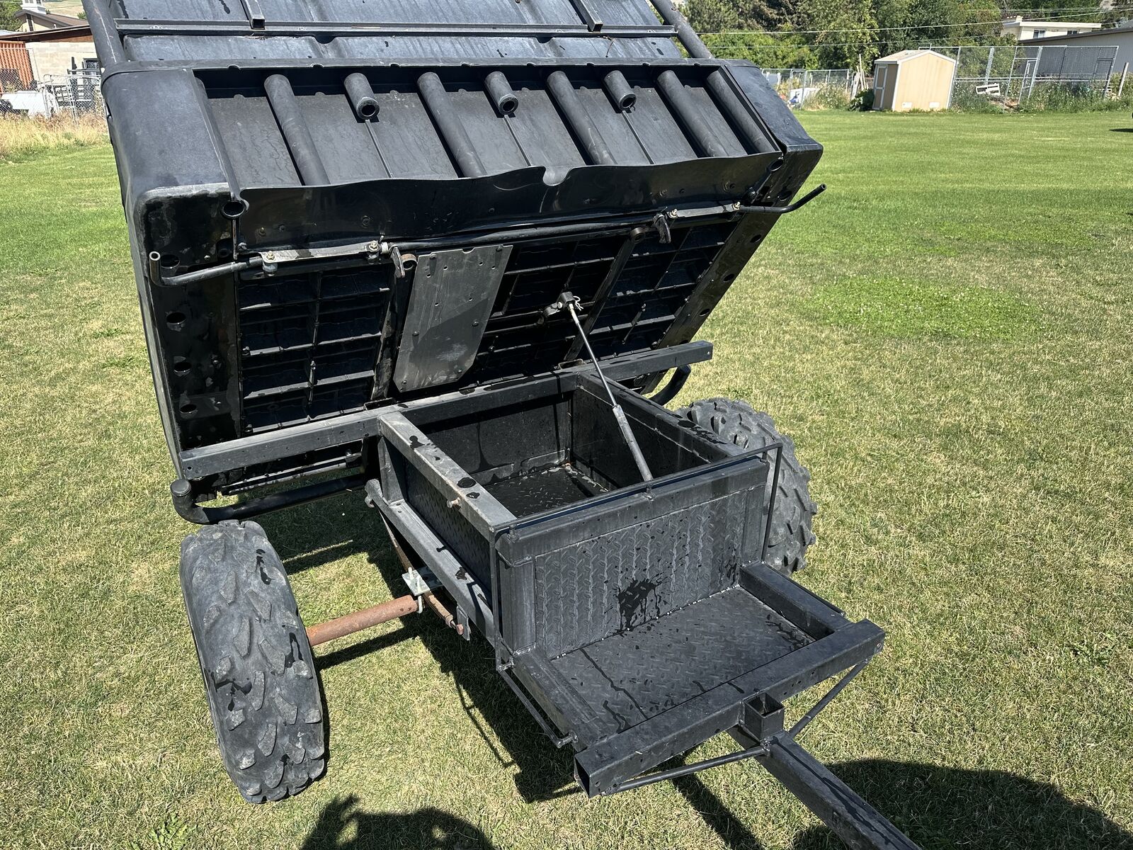 UTV or ATV trailer. tows behind a UTV or ATV. Perfect for hunting, camping, parades, or towing the kids around in the yard. Dump bed, under seat and under bed storage, gas can rack. Seatbelts. Removeablue seat.