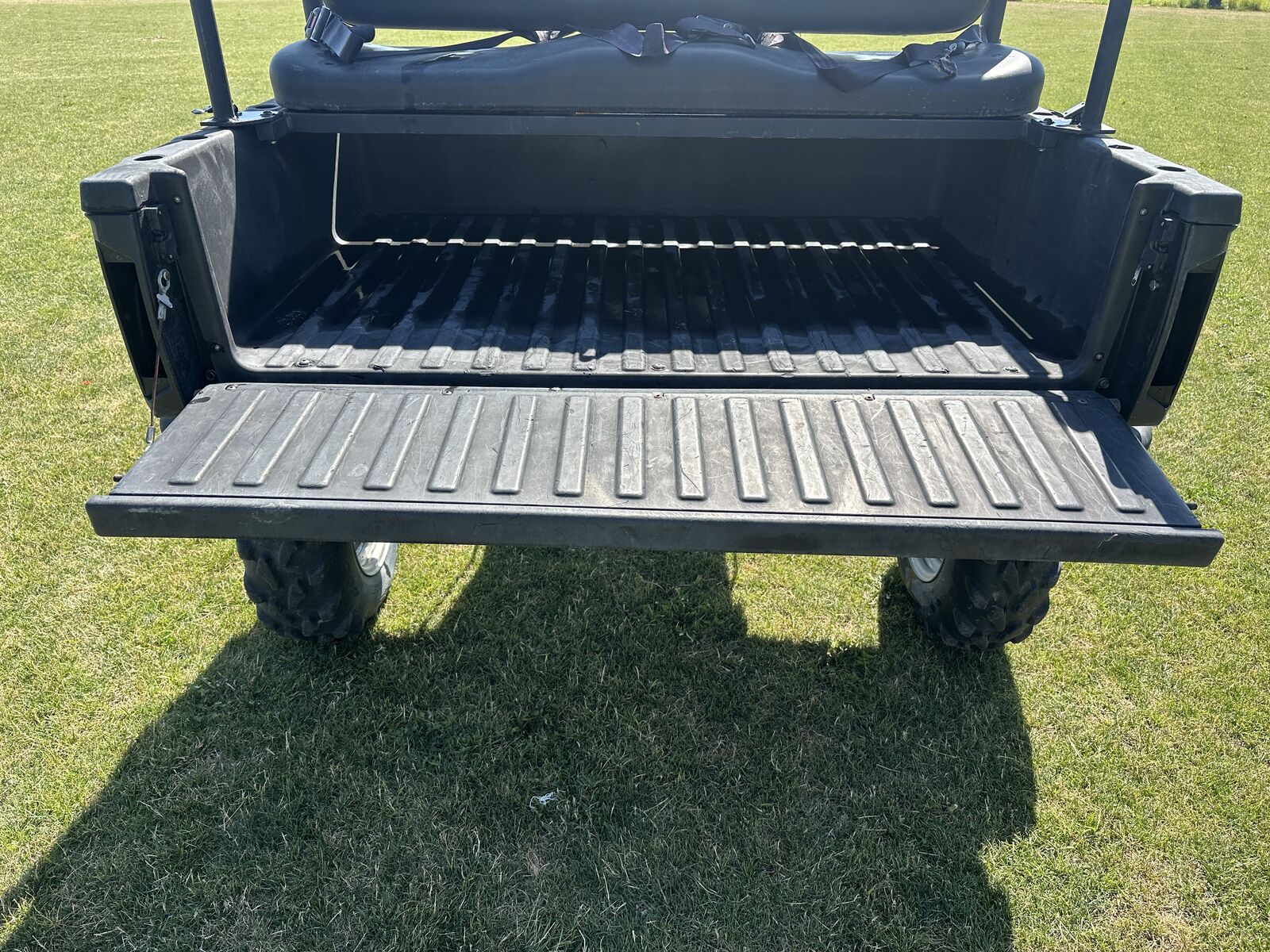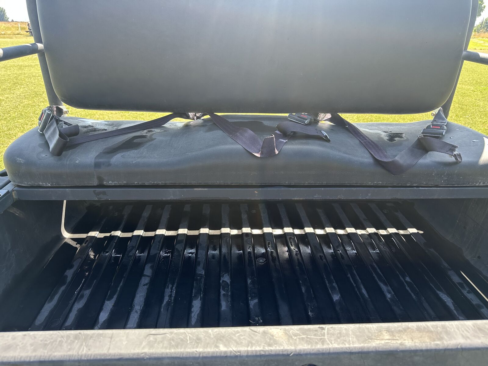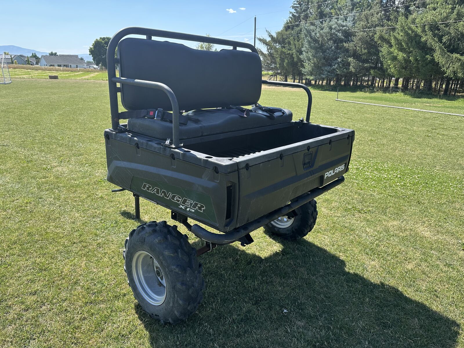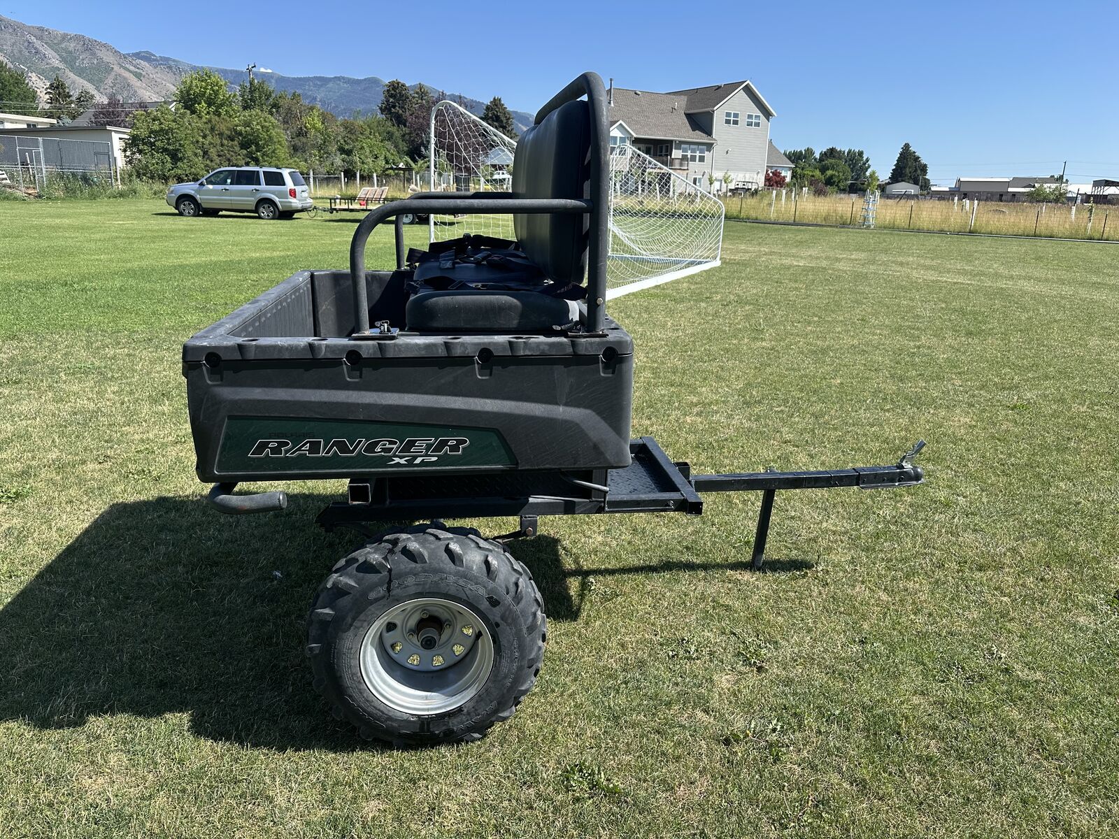 UTV or ATV trailer. tows behind a UTV or ATV. Perfect for hunting, camping, parades, or towing the kids around in the yard. Dump bed, under seat and under bed storage, gas can rack. Seatbelts. Removeablue seat.