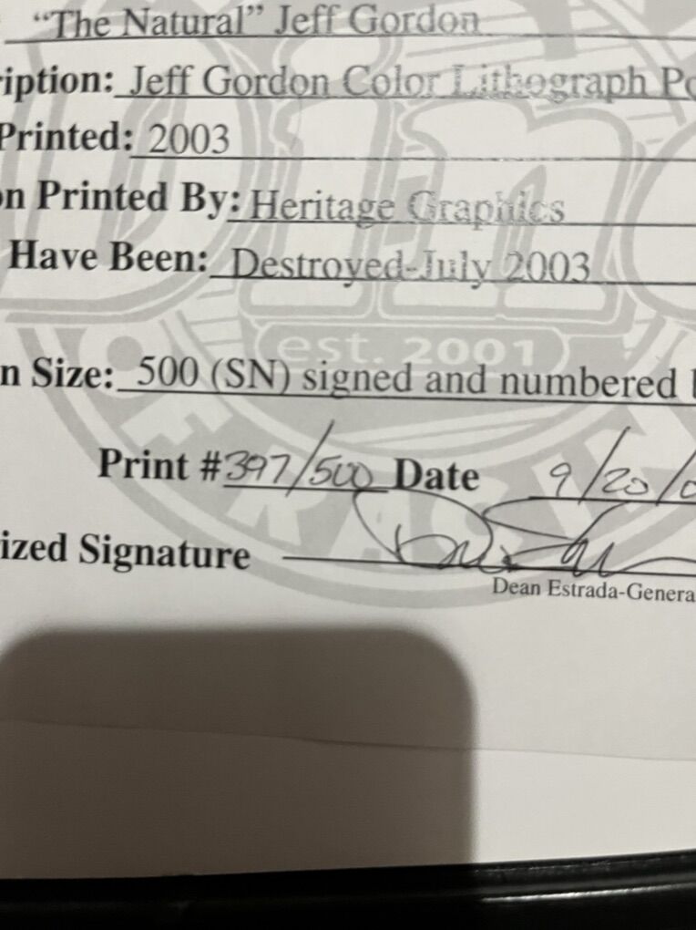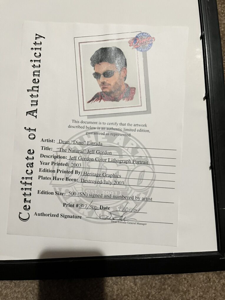 VenmoJeff Gordon Lithograph 397/500 with proof of certification. Excellent condition. Cash or venmo. No codes signed by Dean Estrada. The artist.