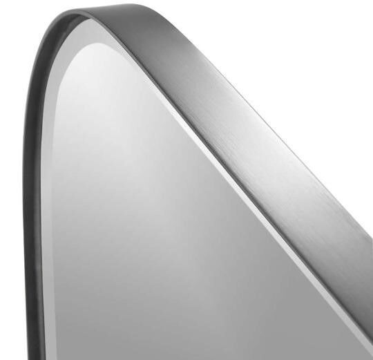 This minimalist wall mirror is heavy and well built, edged with a slim band of silver it curves a rounded rectangle for a modern and elegant silhouette. The mirror can be mounted on the wall horizontally or vertically and is safe to hang in the bathroom. The rounded rectangle mirror is part of our exclusive Edge collection, which includes round, capsule and arched floor and wall mirrors in a modern mix of metals.