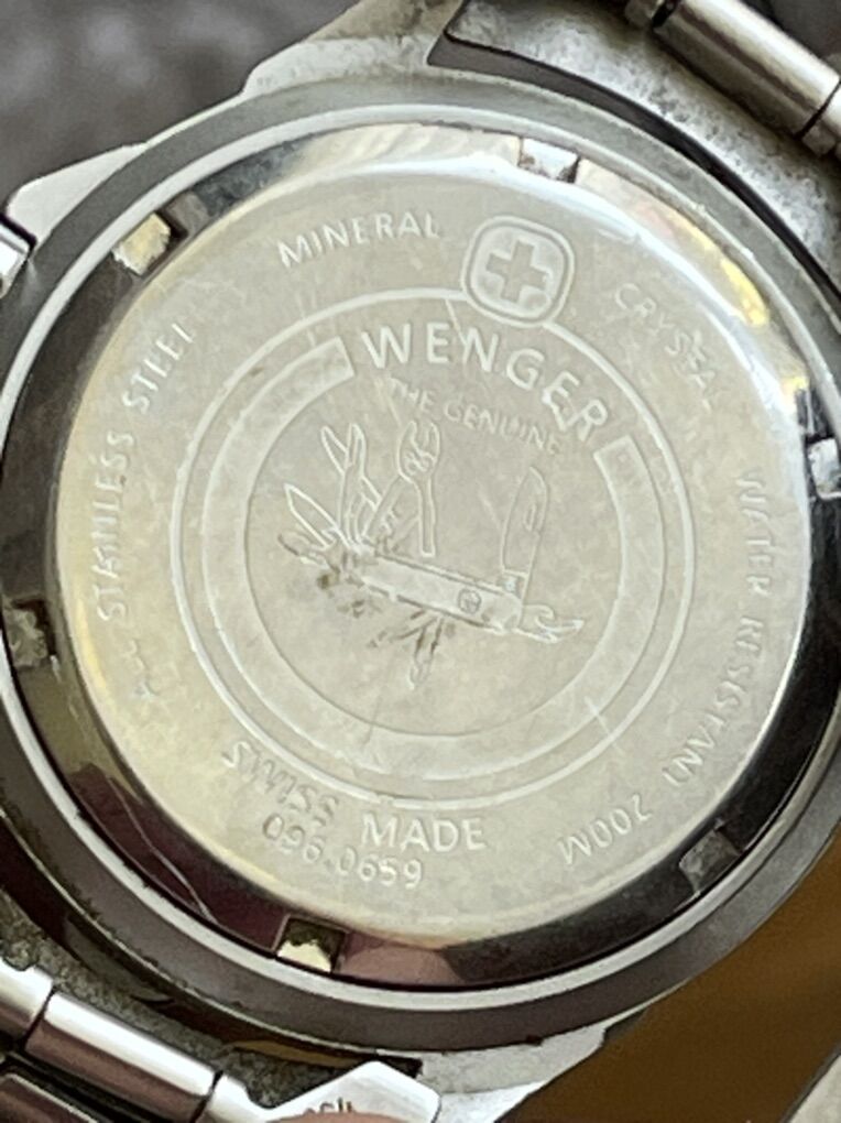 VenmoSwiss Army WENGER 096.0659 Diver 100 MTR Men Watch With New Battery! Works Great Swiss Army WENGER SMT/SAK Diver Men Watch New Battery. Some wear in band and small scratches on crystal and case back. Still a great overall watch, cash or Venmo only.