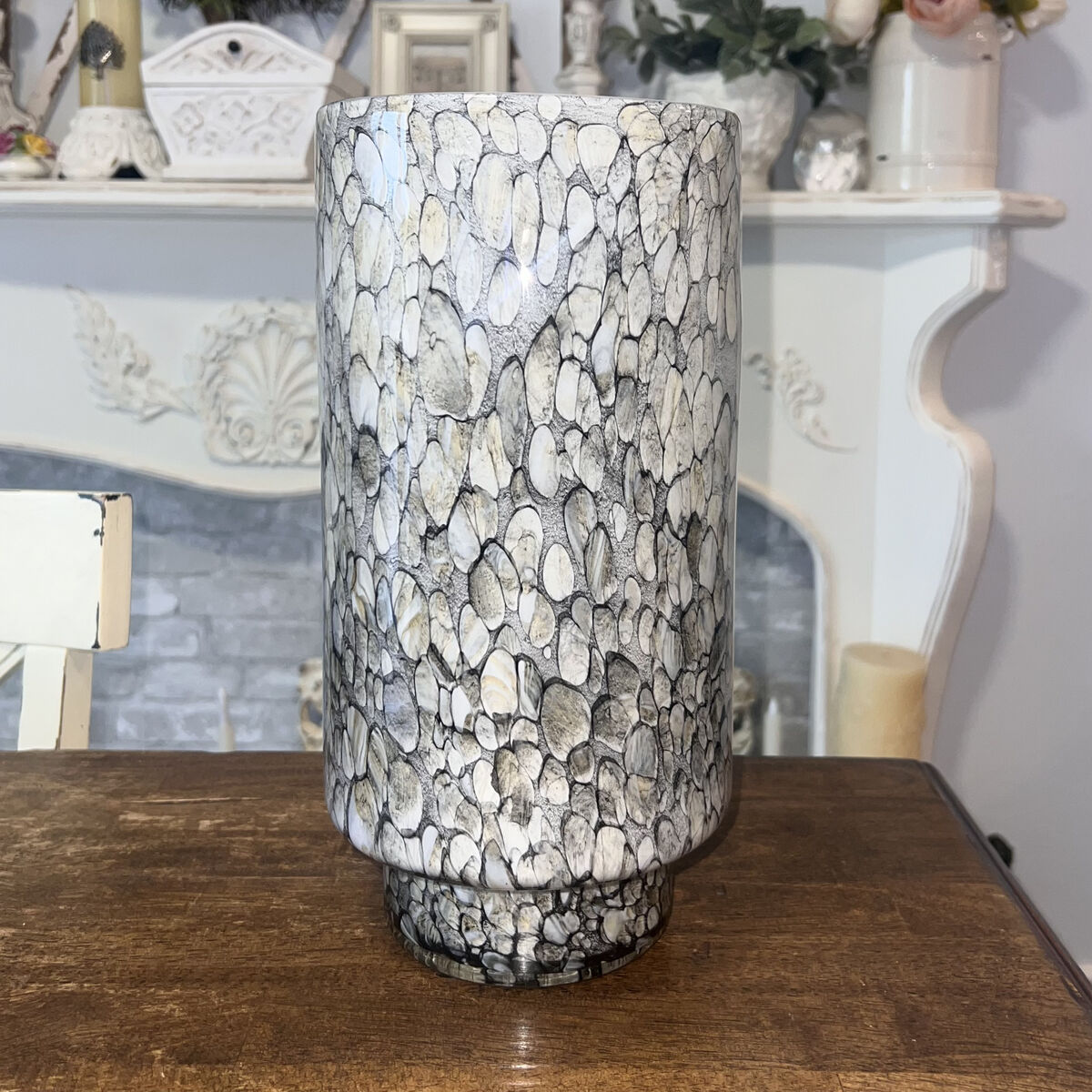 Meticulously crafted using a technique that skillfully combines an amber and gray palette, this neutral scape vase envelops the glass in a captivating display of artistry. Transform your living room, bedroom, dining room, or office into a haven of beauty with this perfect decoration that exudes charm and sophistication.