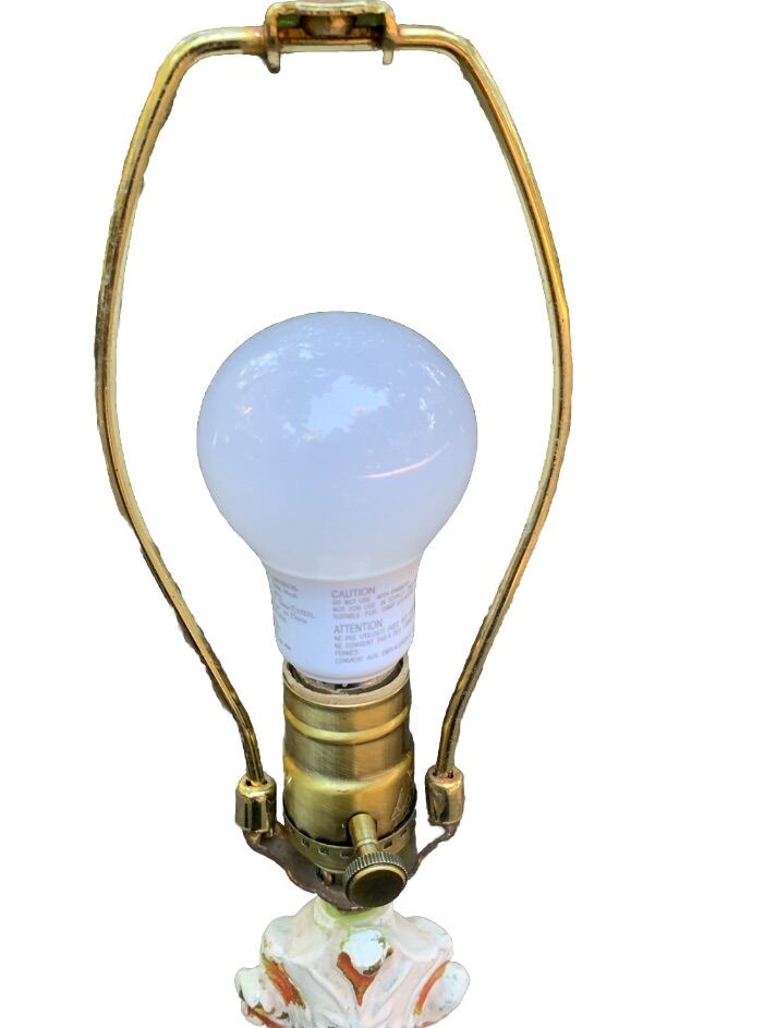Lamp was rewired and given new hardware at some point. Lamp has a few chips, finish cracks, and paint peeling. Gives it a nice patina. It’s 29.5” tall with finial. Shade and finial are not original.