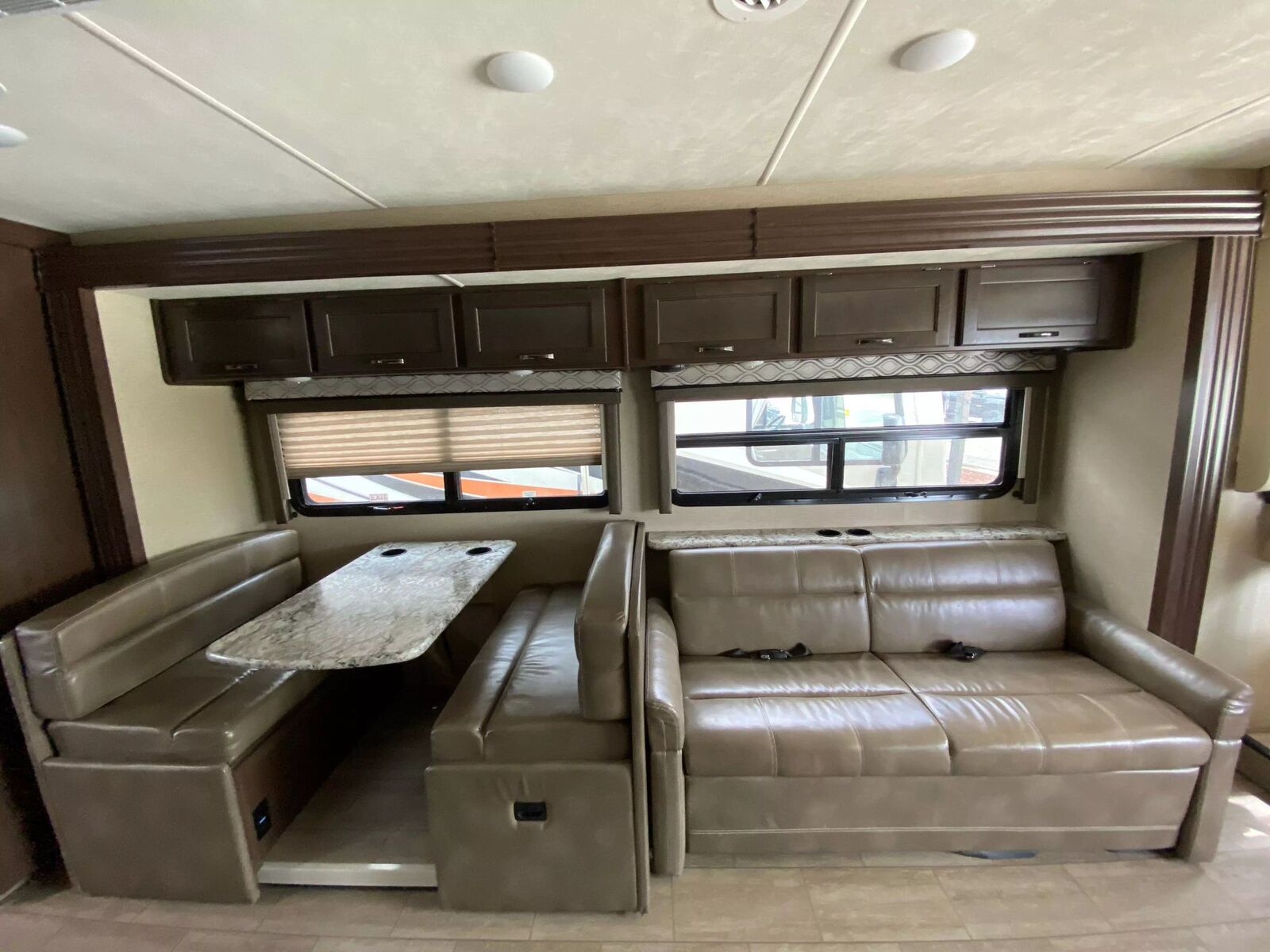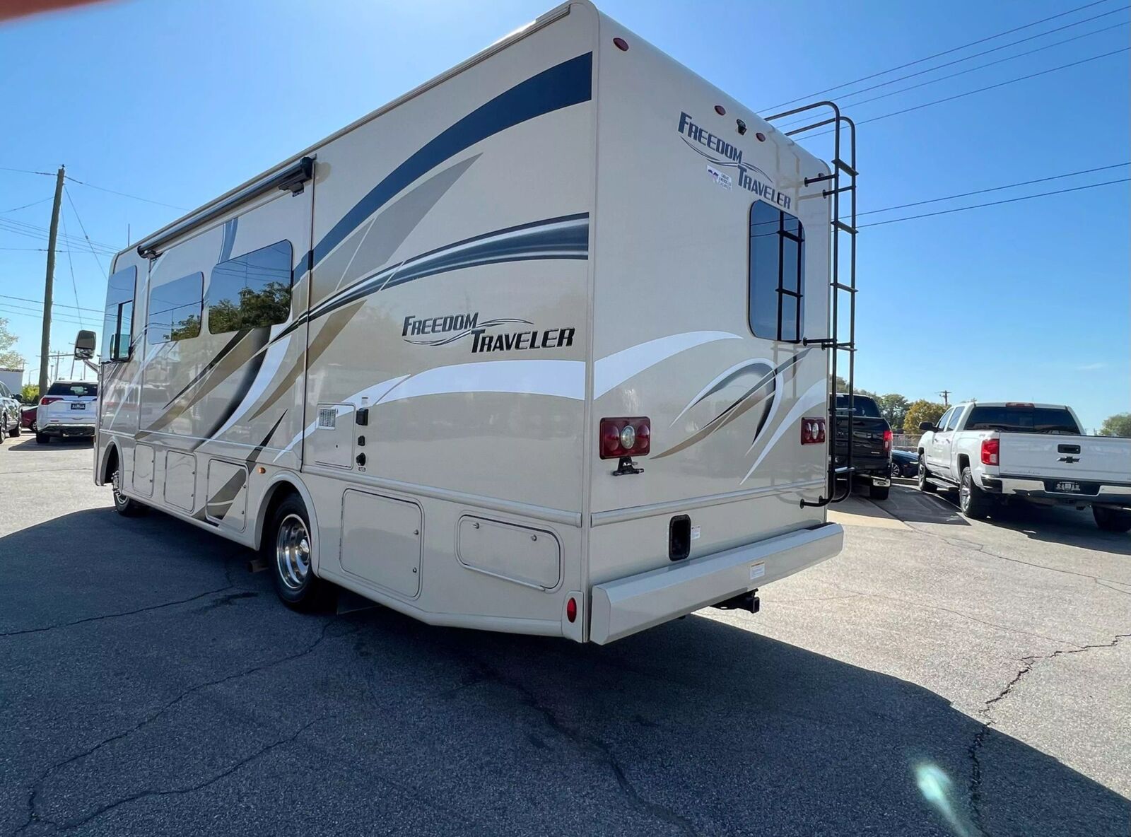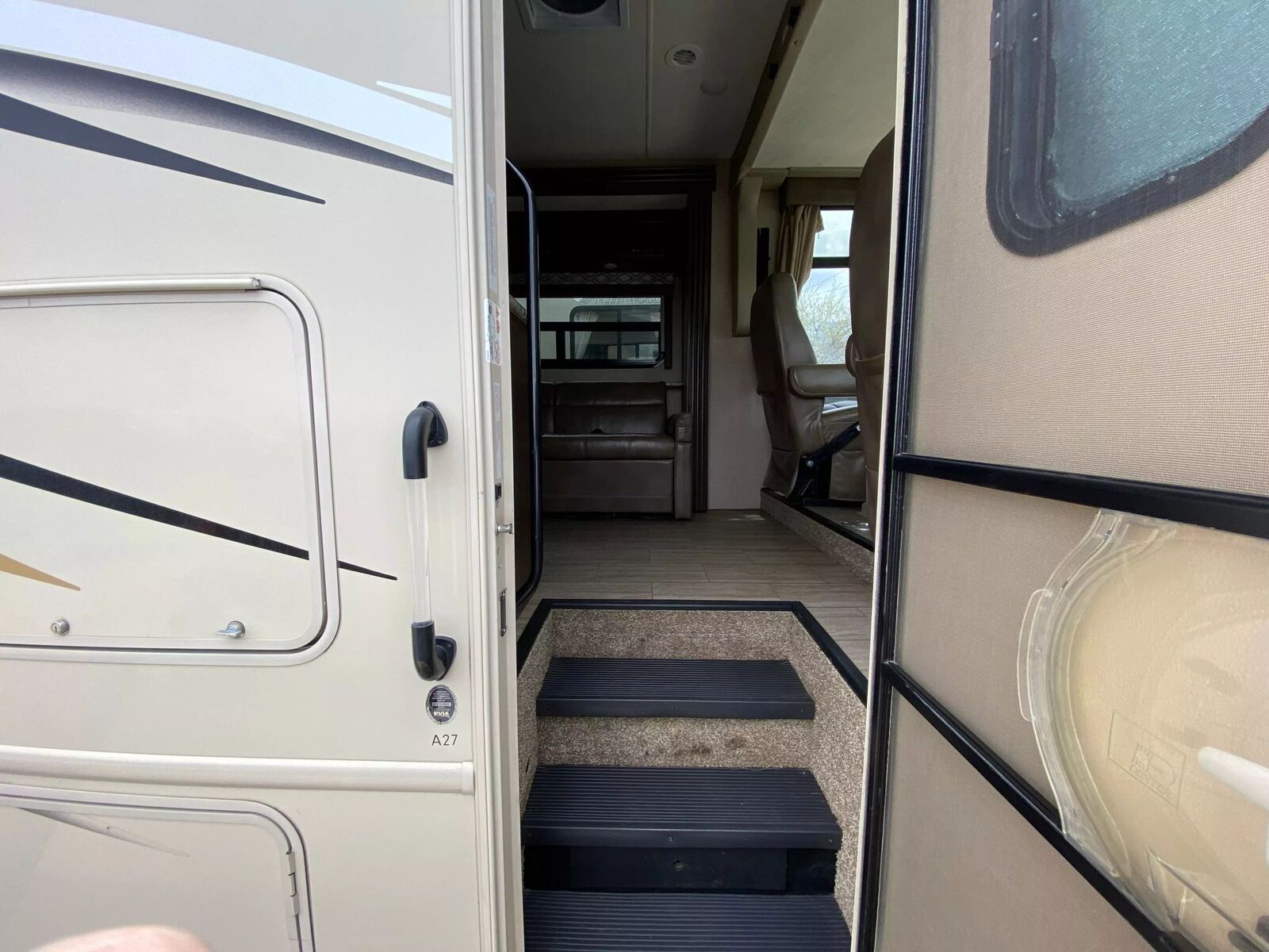 This 29ft Class A Motor Coach comes equipped on a Ford F-Series chassis with a Triton V10 engine with 43,297 miles, automatic transmission, rear wheel drive, dual rear wheels, tow package, tow/haul mode, back up camera, two power slides, power awning, roof access ladder, exterior storage compartments, power man door steps, driver and passenger leather swivel chairs, heat/cool cab climate controls, power heated mirrors, cruise control, overhead power bunk bed, two man convertible sofa with seat belts, full kitchen set up with oven, stove top, sink, microwave, refrigerator and freezer, Axxera flat screen TV on wall mount, dinette with bed capabilities, large hall way closet, rear master bed room with Axxera flat screen and closet space, full bathroom with sink shower and toilet, Coleman-Mach AC/heat climate control, Axxera media unit, and more! Come in and check it out today!