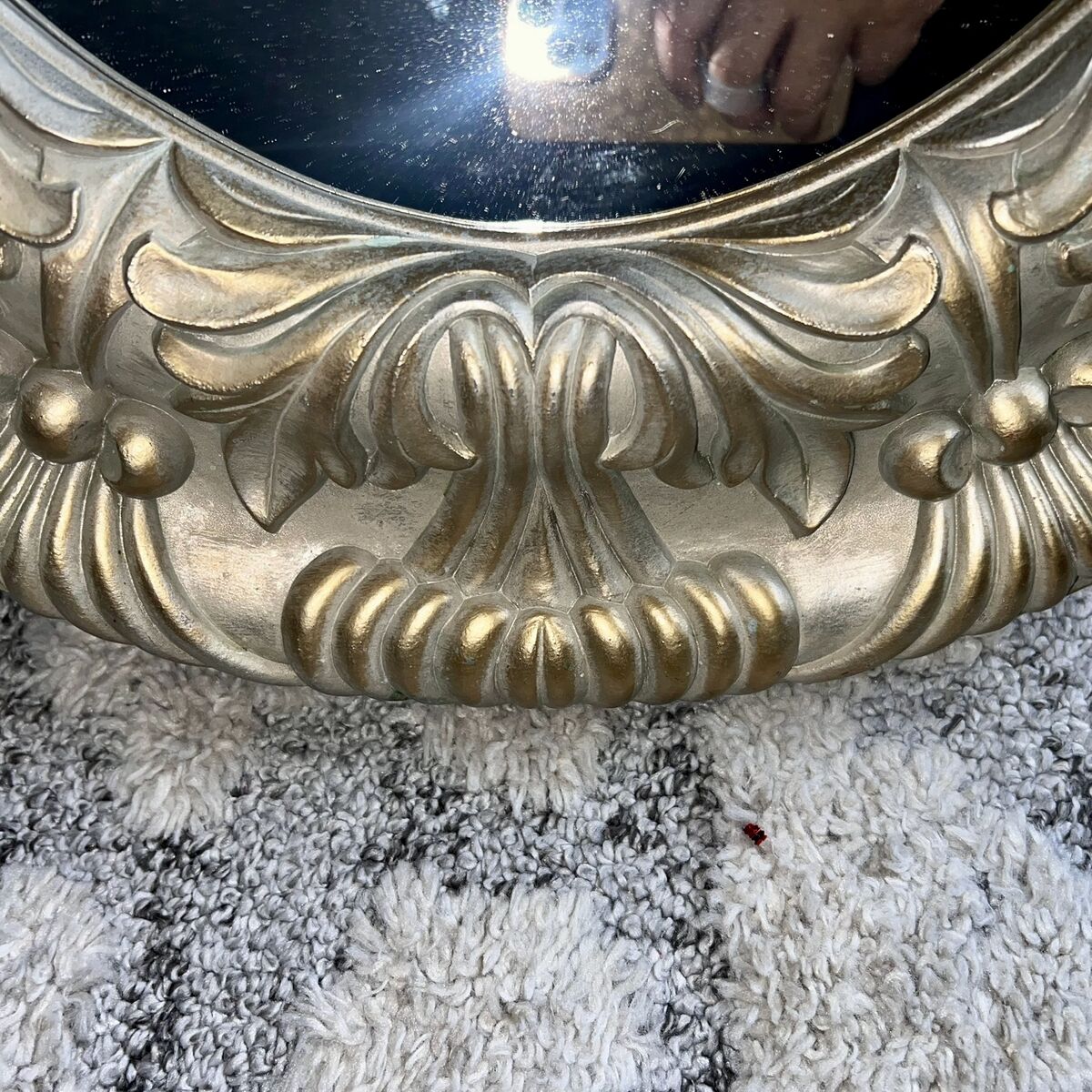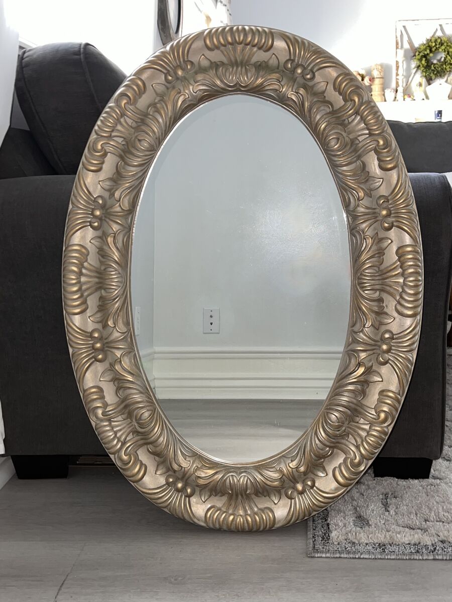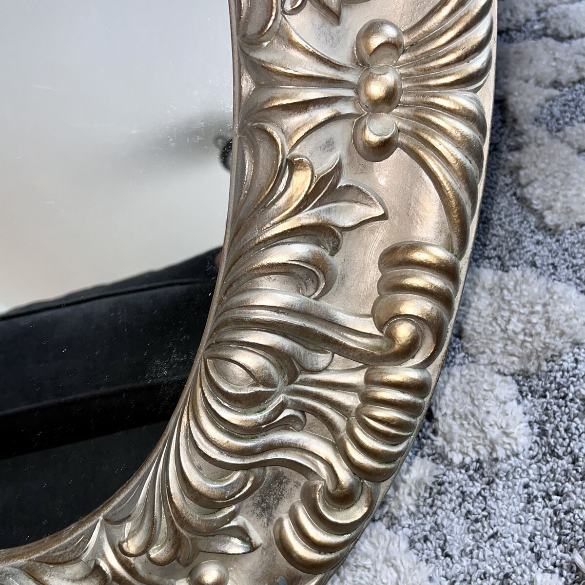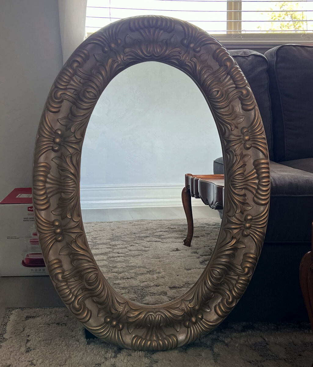 VenmoThis large vintage mirror from Home Interiors is gorgeous! It was sold in the late 70's or early 80's. It features an ornate molded resin frame in an antique gold finish. It has the original sticker on the back, and it is in excellent condition. It was made in two sizes; this is the larger version. It's perfect for a bedroom, hallway, living room, or entryway. The only reason I am selling it is that I have accumulated so much decor in my storage, and it's time to downsize. I added two pictures next to my couch for size reference. The price is firm, as it is vintage and a very unique find.