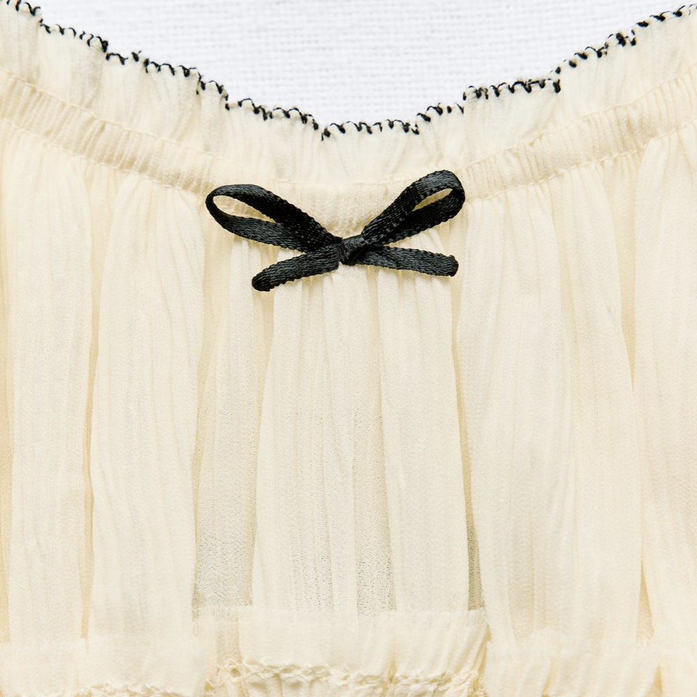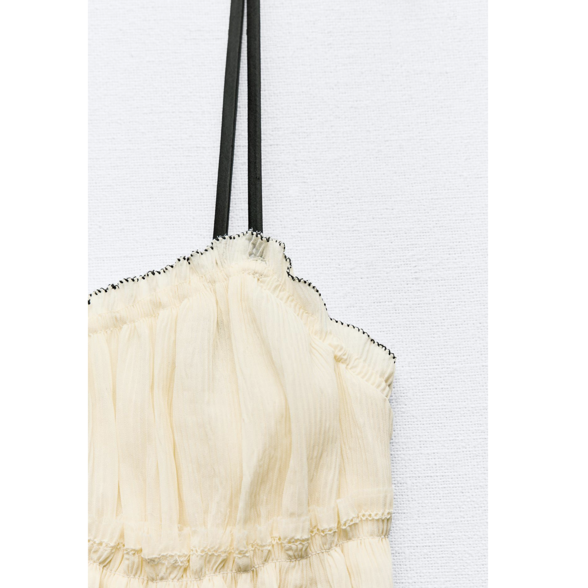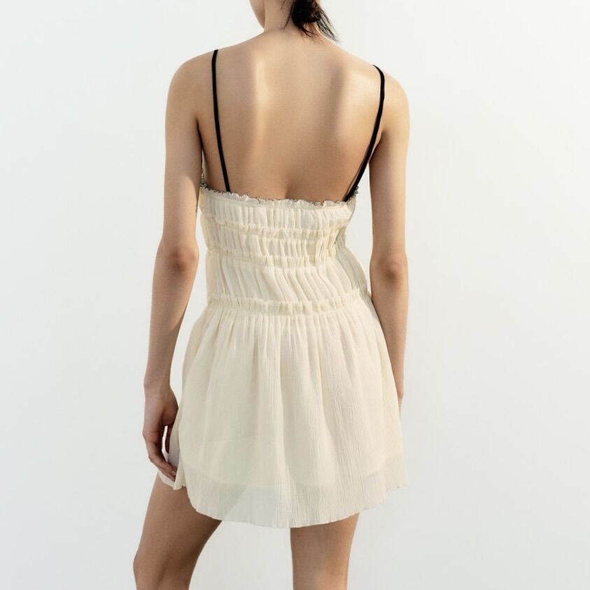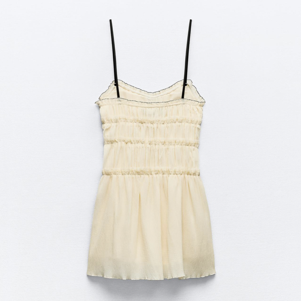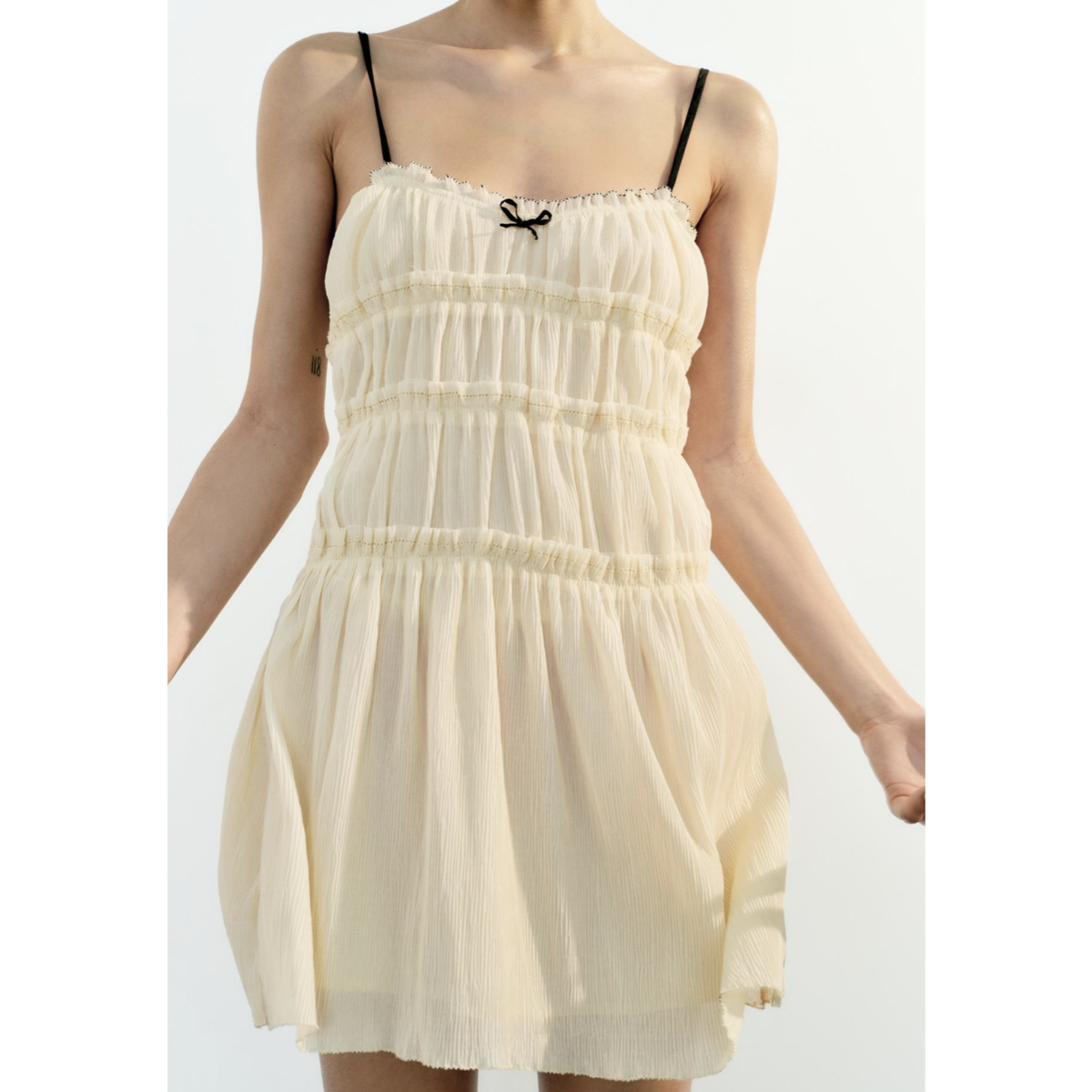 VenmoWorn once. Gorgeous textured slip dress from Zara in size Large. Slight V-neck mini dress with contrasting spaghetti straps. Elastic trim and little bow appliqué. Tonal interior lining. Bought for $49.90.