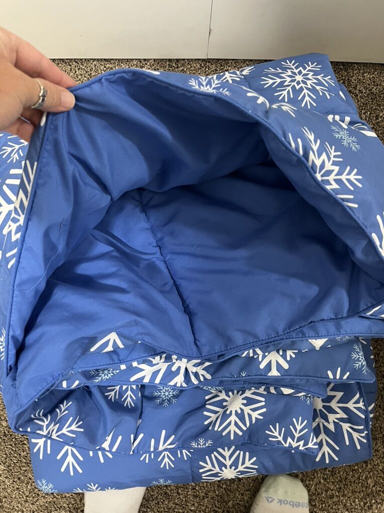 ZelleGreat shape, you can use either side, snowflake side or solid blue. Clean smoke free home.