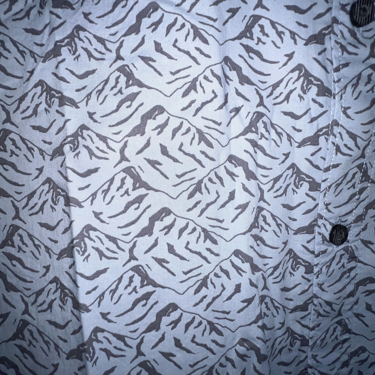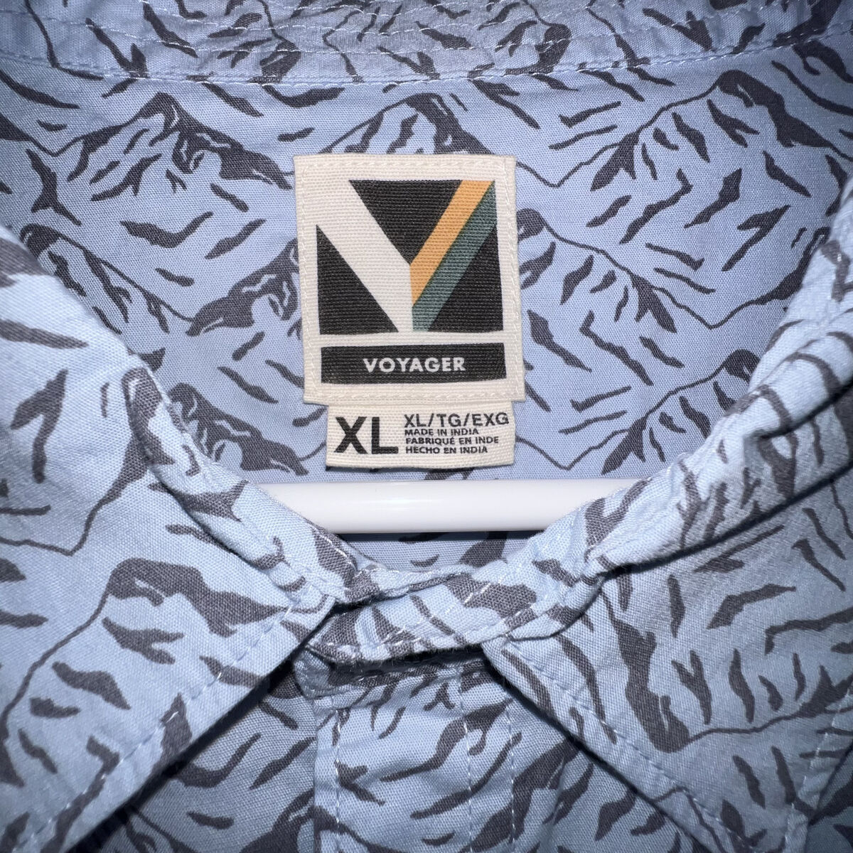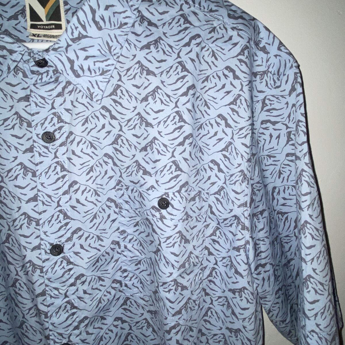 VenmoThis is new without tags. I bought it for my husband and it was too big. It is an XL, but it's regular fit. My husband wore an XL in slim fit. It has a subtle mountain print and is 98% cotton and 2% elastane, giving it a slight stretch. Nice shirt!