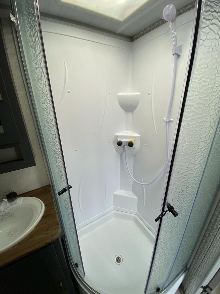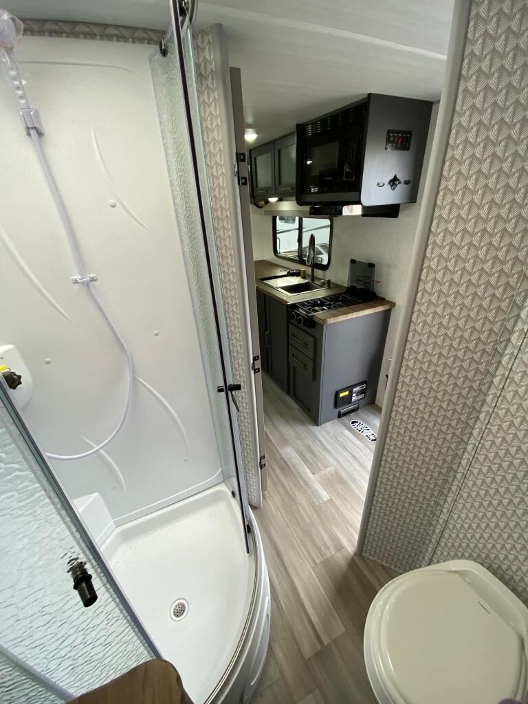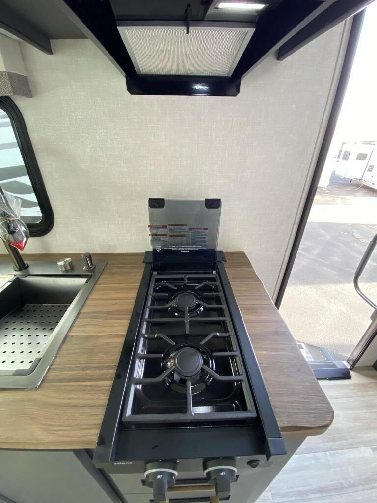 This Ibex travel trailer is incredibly versatile! With two sofas, there's plenty of room to relax inside, or set up outdoors under the 16' awning. There's a 60" x 80" Murphy bed where you'll be able to sleep comfortably, and you can dine in style at the L-shaped countertop with bar stool seats and chat with the cook in the kitchen. At the rear you'll find a full bath with a radius shower, a toilet, and a sink with a medicine cabinet above it. When the optional Beast Mode Package is chosen, you'll enjoy an independent suspension, 400 watts of solar power, a 30A charge controller, and a 2000W inverter.