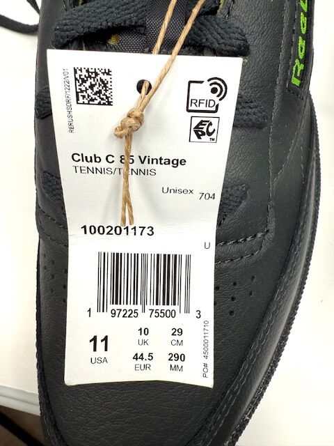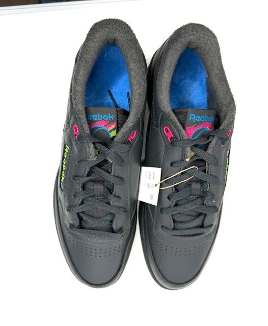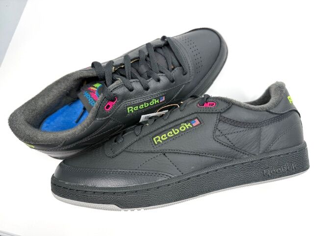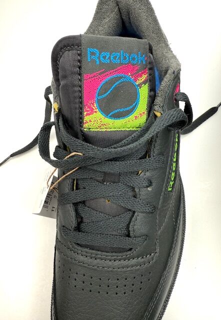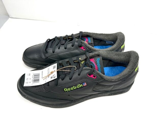 VenmoNew in box Reebok Club C 85 tennis shoes New bold colors have been added to the vintage court shoe. Full-grain black leather upper Bright blue terry lining '90s-inspired tongue logo Wide laces EVA midsole Gray rubber outsole Size 11