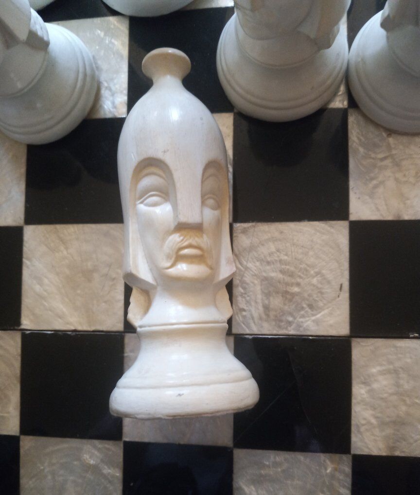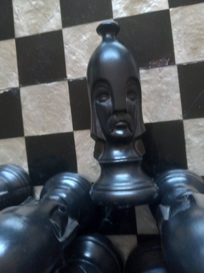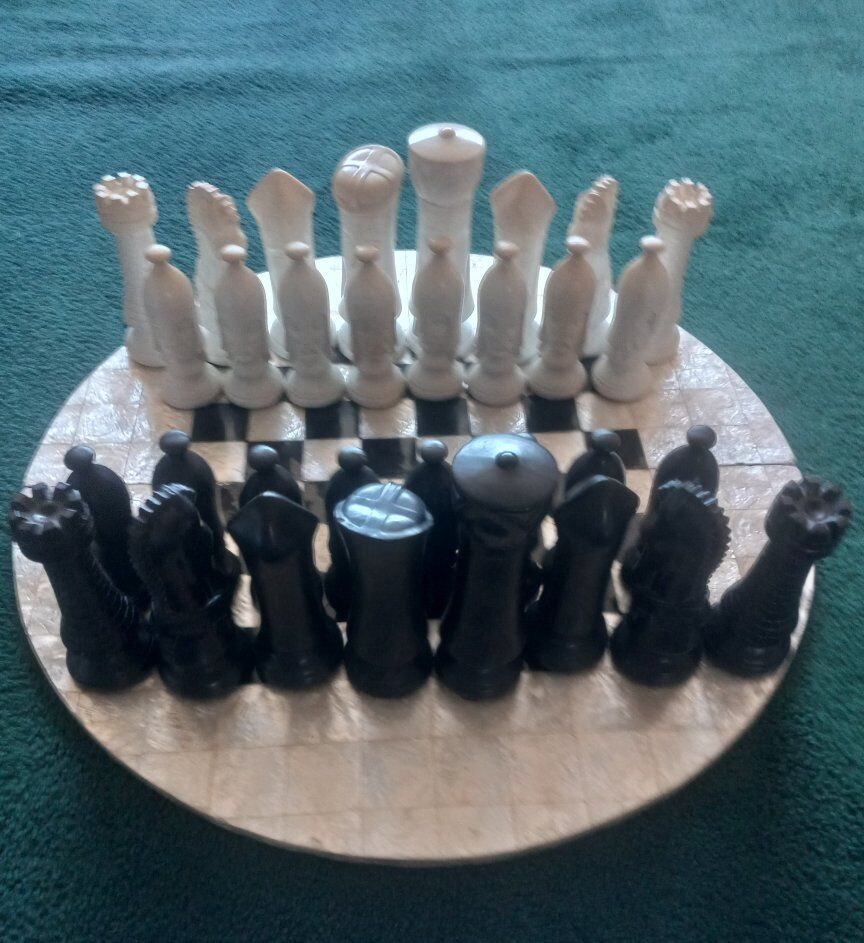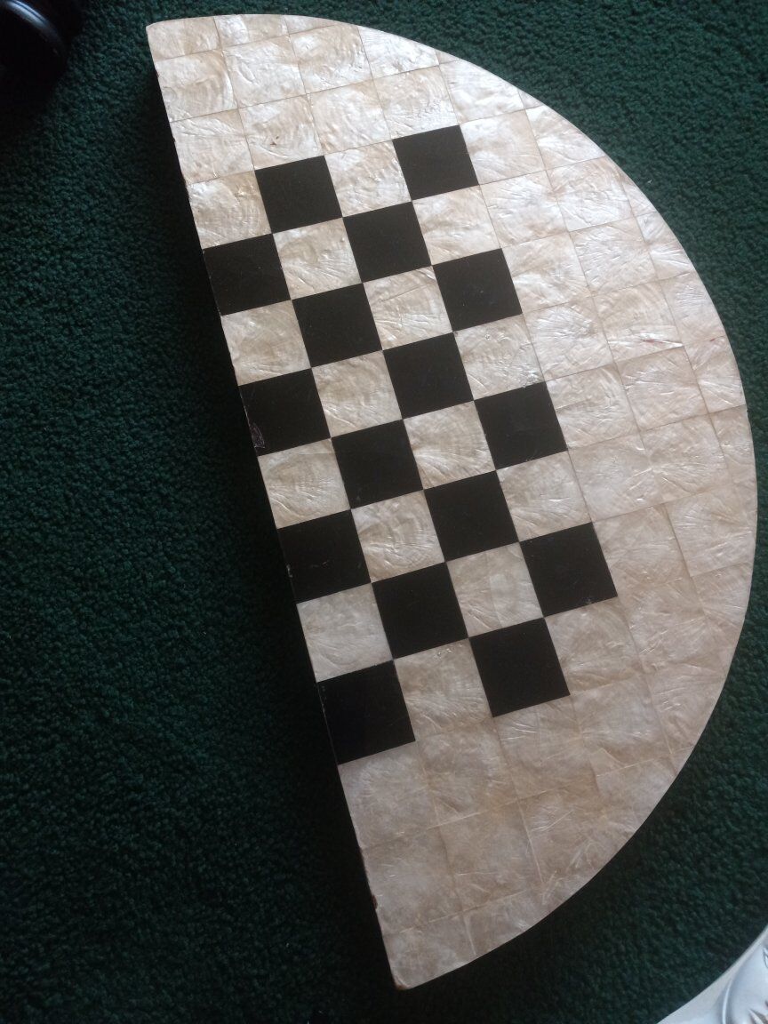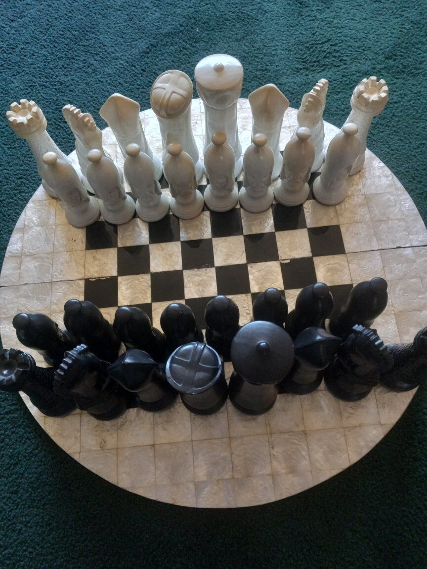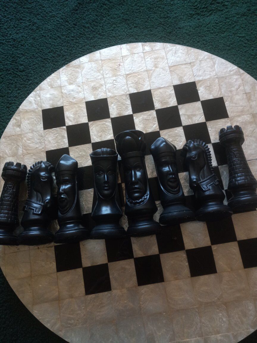 Antique chess set Mother of Pearl board measuring 26" diameter x 1/2" thick black & white board and pieces. The king is 8" tall base is 2.5" dia. all others follow suit about 1" smaller. The pawns are 5.5"tall 2 1/4" Dia. this is a fabulous set for a collector. one piece has been repaired on the bottom barely noticeable.0 t