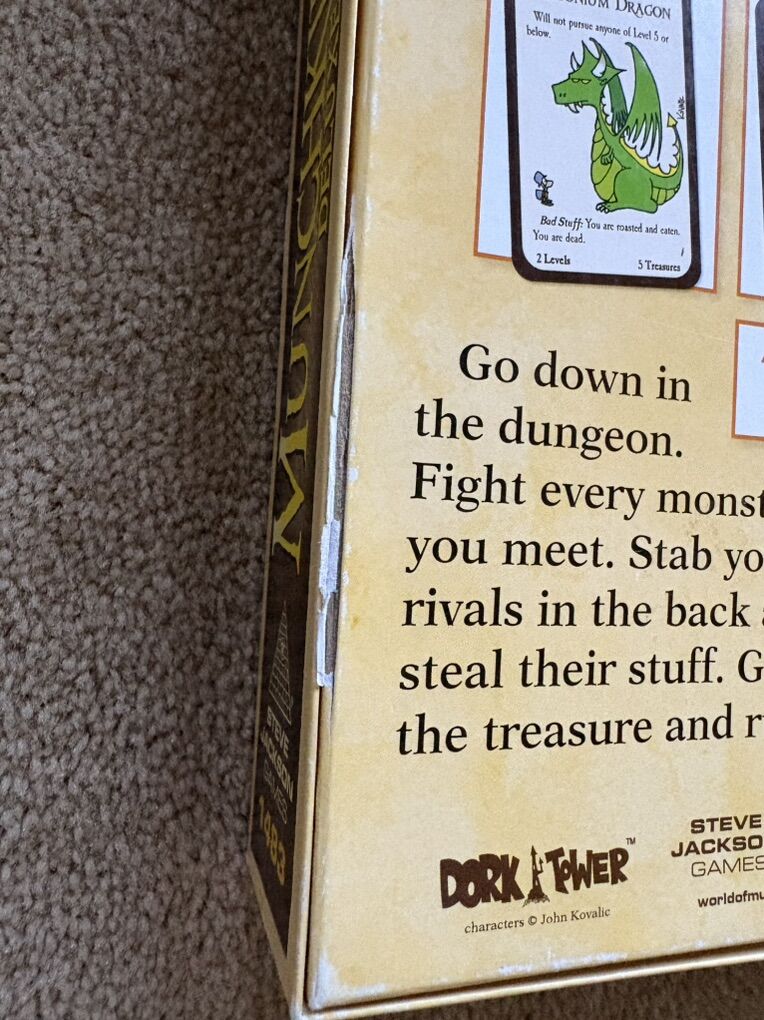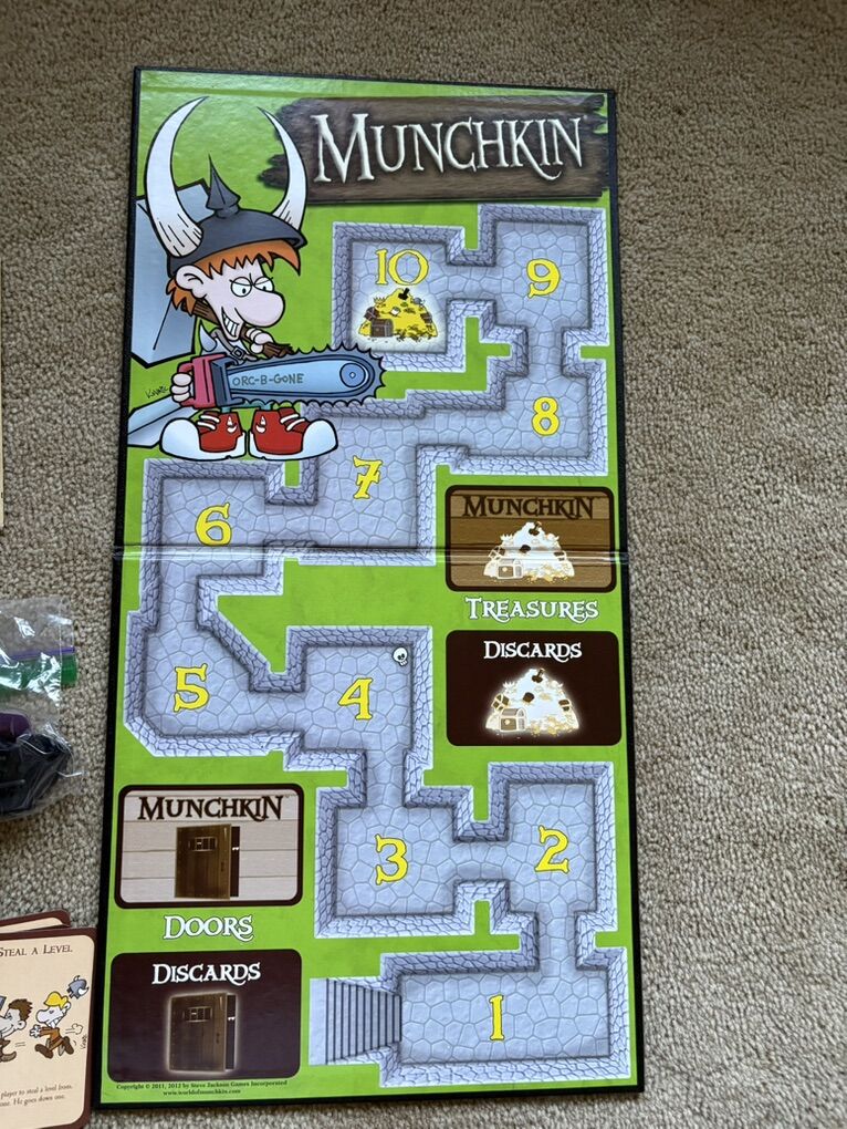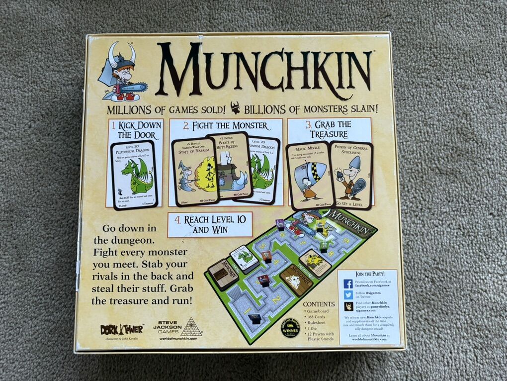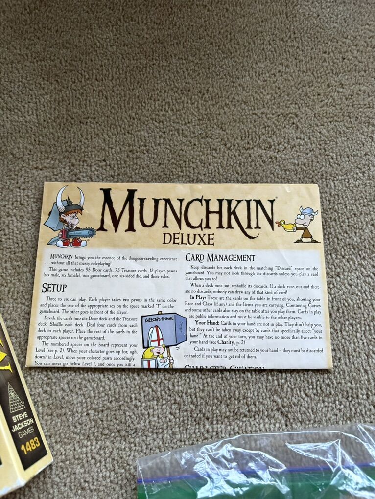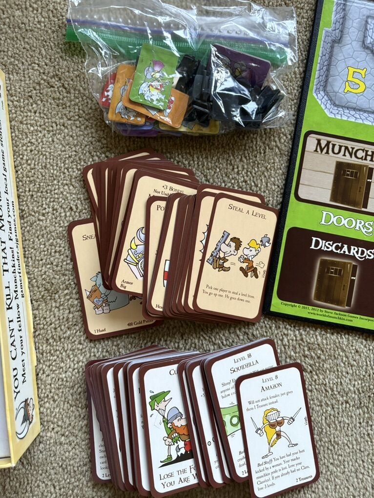 COMPLETE Munchkin Deluxe Game: Kill the monsters, steal the treasure, stab your buddy. Award-winning game by Steve Jackson, John Kovalic, 2014. 3-6 players, age 10+. Complete, no missing pieces. Very good condition (corners of box slightly worn--see photos). Text only. Cash or Venmo.