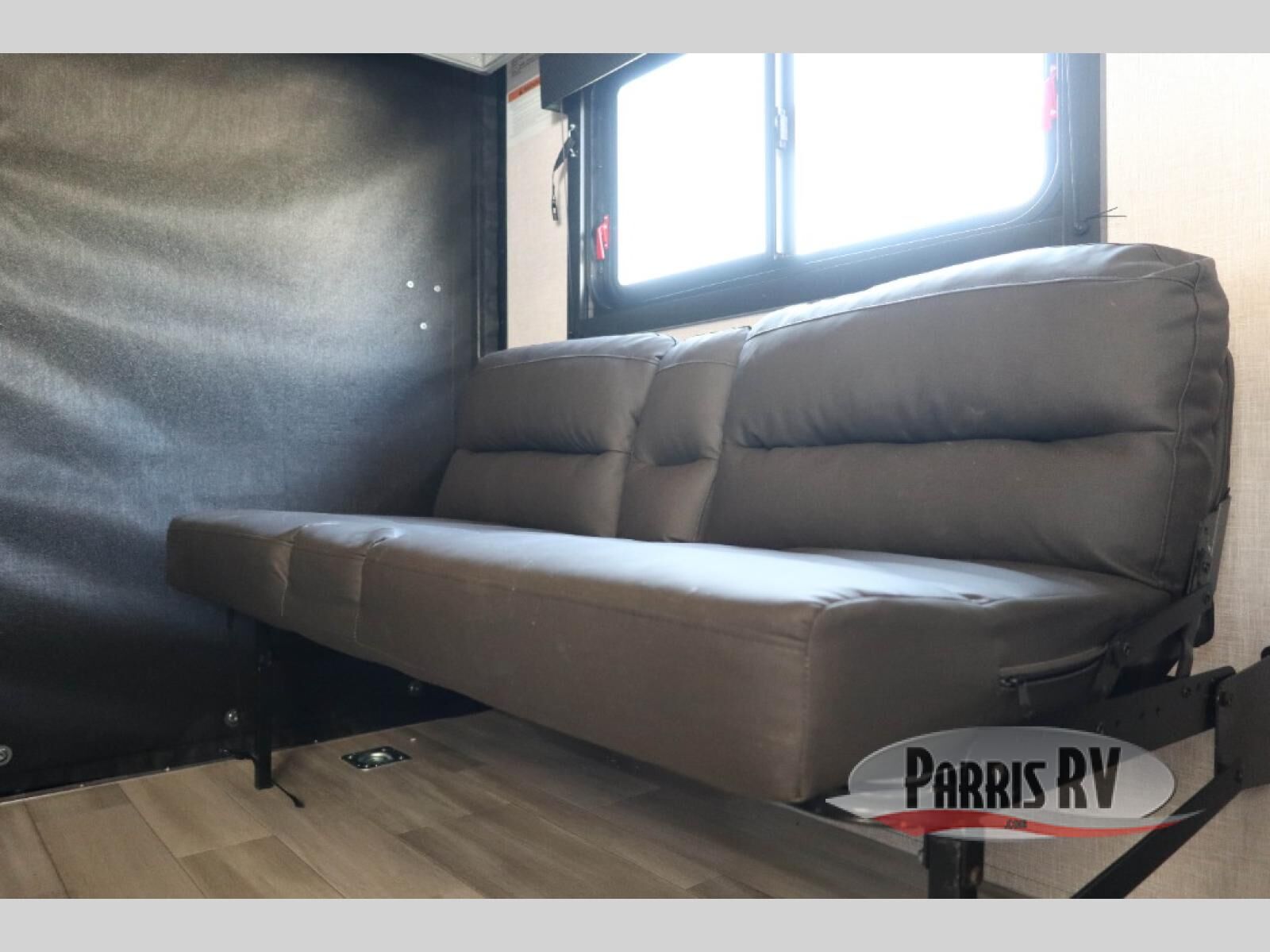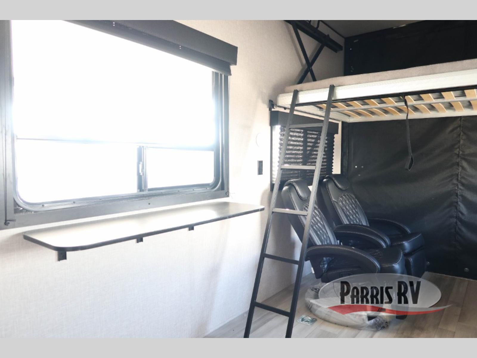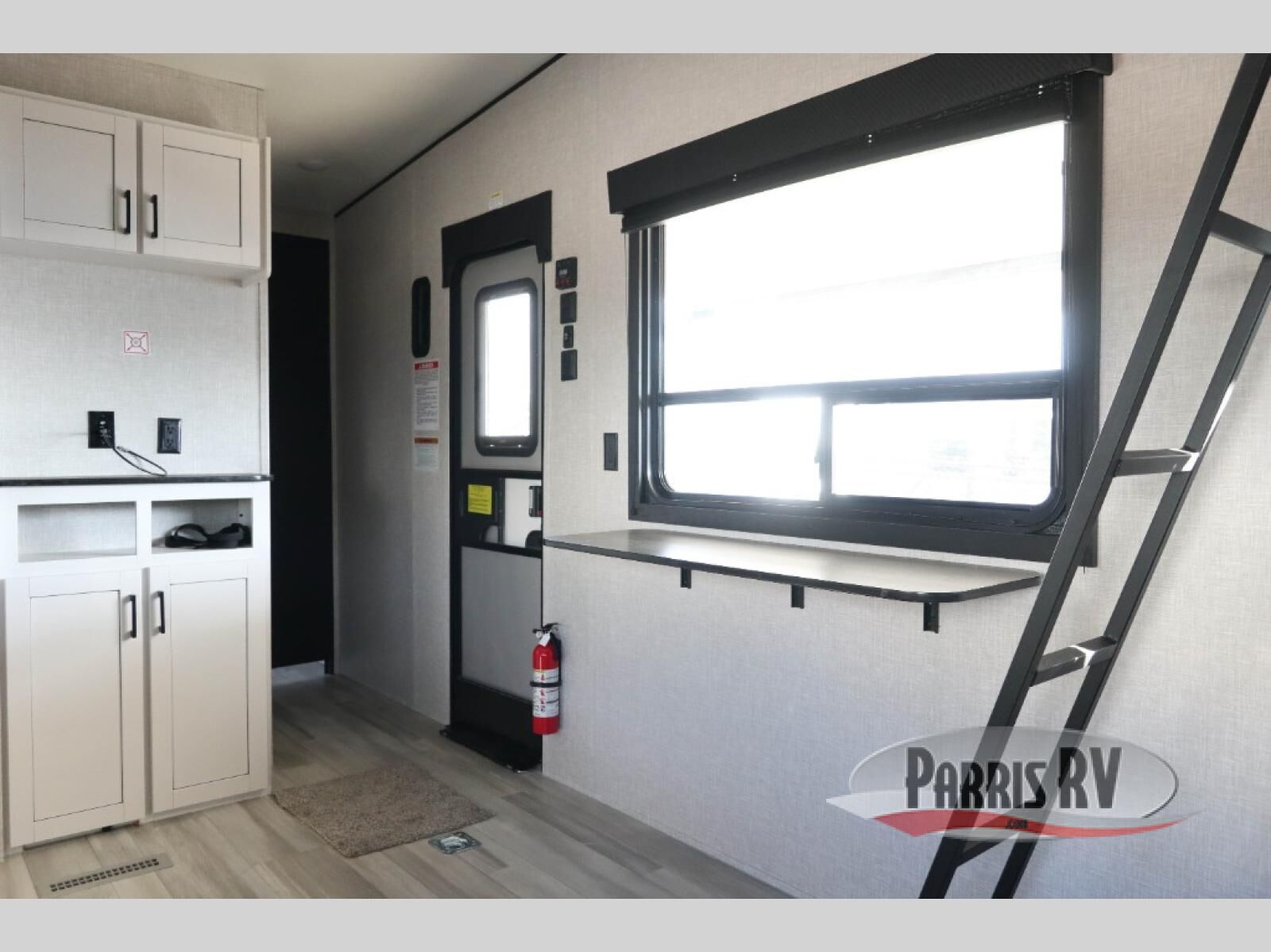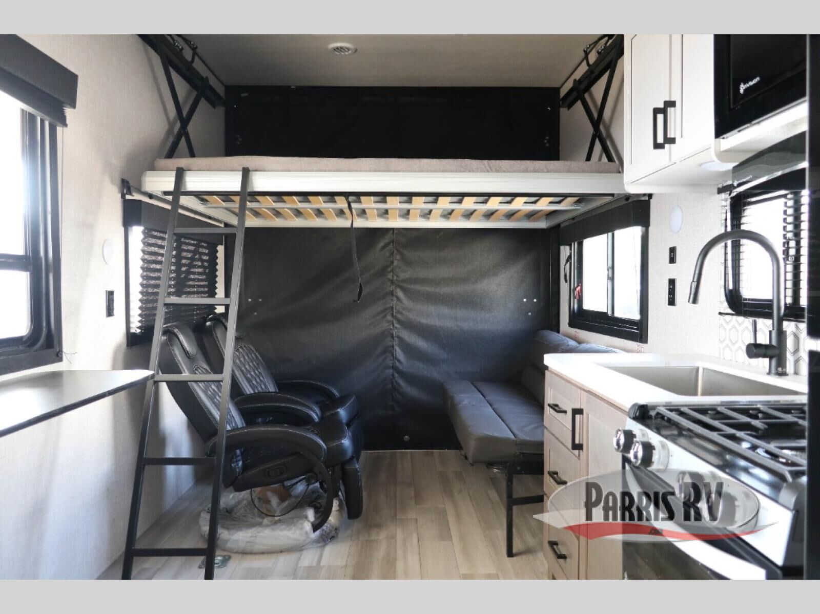 You will have everything you need for a comfortable camping trip in this toy hauler! Unload your off-road toy easily from the cargo area featuring up to 14' of space using the spring assist 8' ramp door for a fun day out on the trails. The fully equipped kitchen has a three burner cooktop to fry up some eggs in the morning, and you can enjoy them at either the flip-up bar top with two stools or at the rear convertible sofa and two chairs in the other side if the removable table. The dual entry bathroom is easy to access from the front private bedroom and it has a radius shower to wash the mud out of your hair.