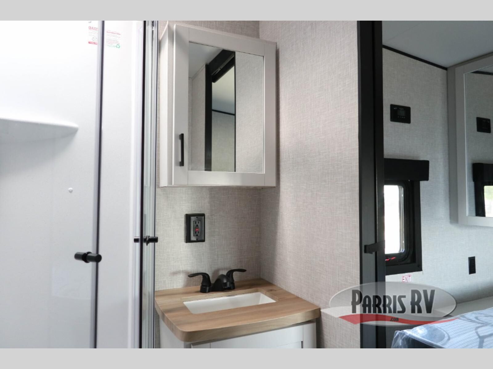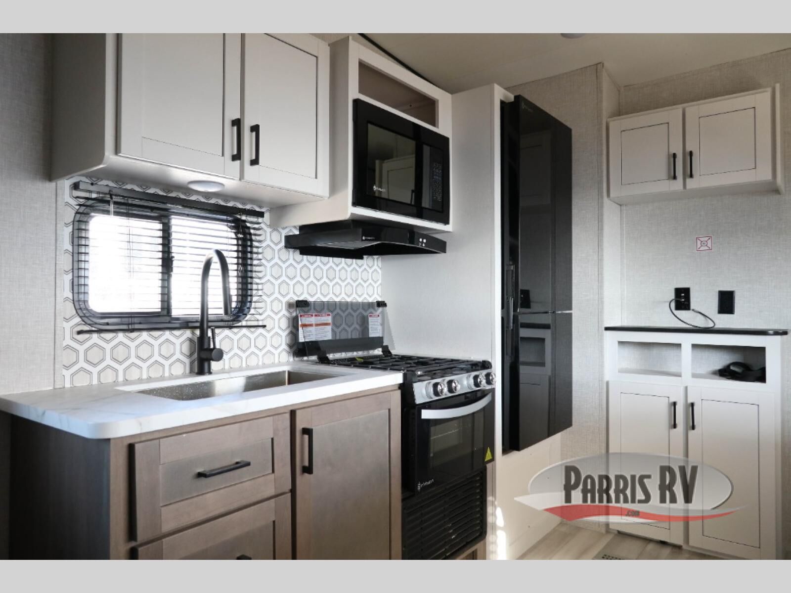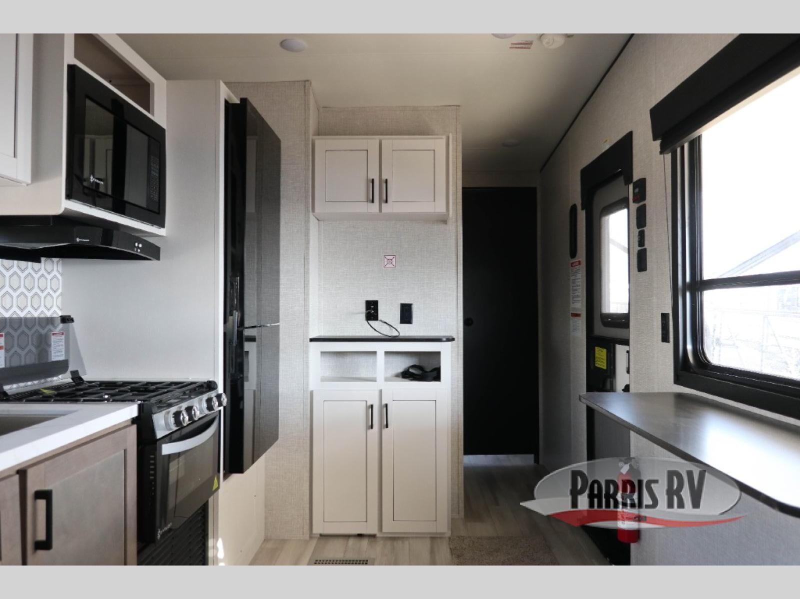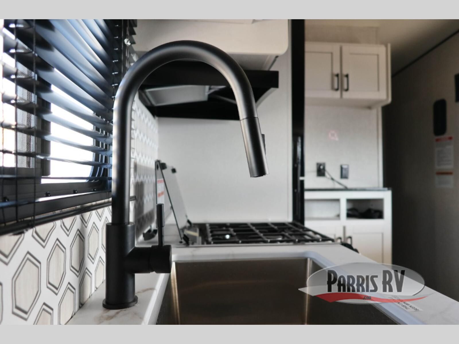 You will have everything you need for a comfortable camping trip in this toy hauler! Unload your off-road toy easily from the cargo area featuring up to 14' of space using the spring assist 8' ramp door for a fun day out on the trails. The fully equipped kitchen has a three burner cooktop to fry up some eggs in the morning, and you can enjoy them at either the flip-up bar top with two stools or at the rear convertible sofa and two chairs in the other side if the removable table. The dual entry bathroom is easy to access from the front private bedroom and it has a radius shower to wash the mud out of your hair.