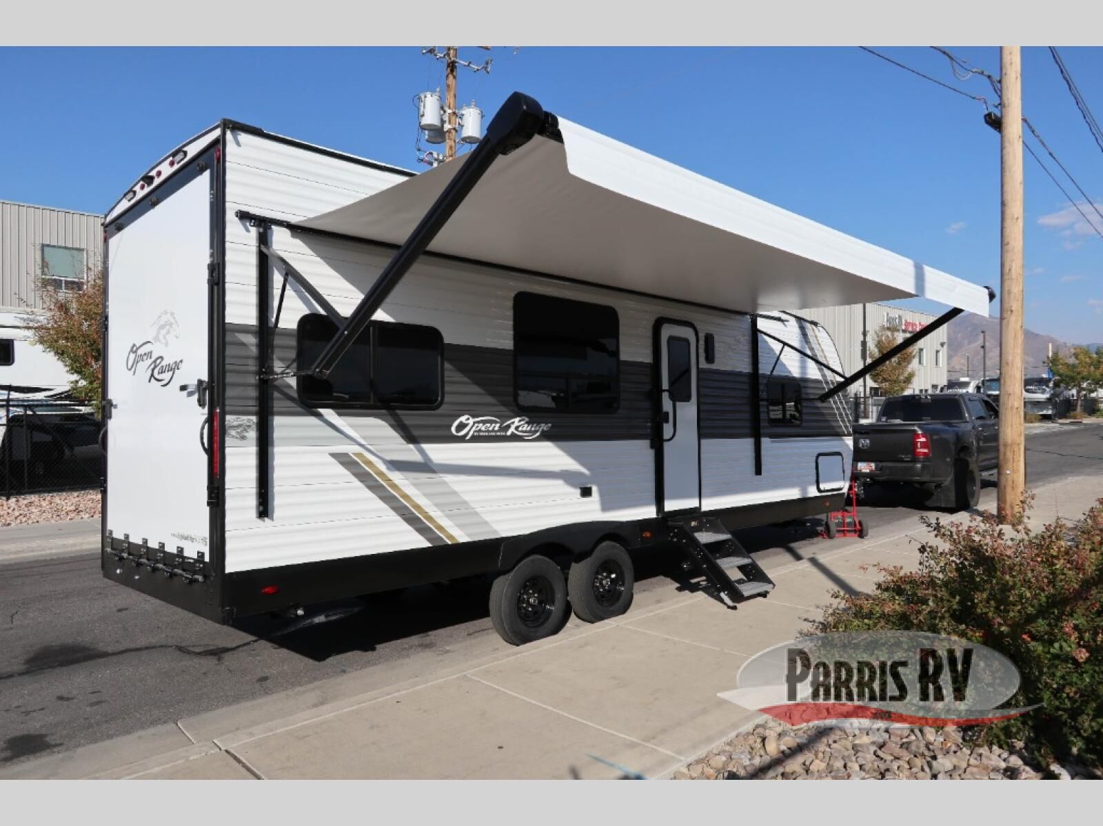The affordable Open Range Conventional travel trailers by Highland Ridge are ready to meet your camping needs! You will appreciate the durable Magnum Roof system, plus each model is constructed with black front diamond plate protection, 5/8" main floor decking, and self-adjusting electric brakes with E-Z Lube axles for smooth towing. The 81" interior height means you won't feel cramped when relaxing with friends and family, and the residential vinyl flooring throughout is easy to clean, which will be perfect if you're camping with little ones or pets. These models also include a ceiling mount Bluetooth speaker, a digital TV antenna that will go perfectly with the optional Smart TV, plus a 13,500 BTU roof mounted A/C to keep you cool on those hot summer months.