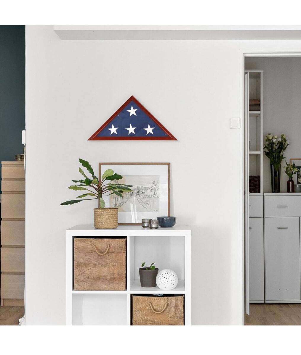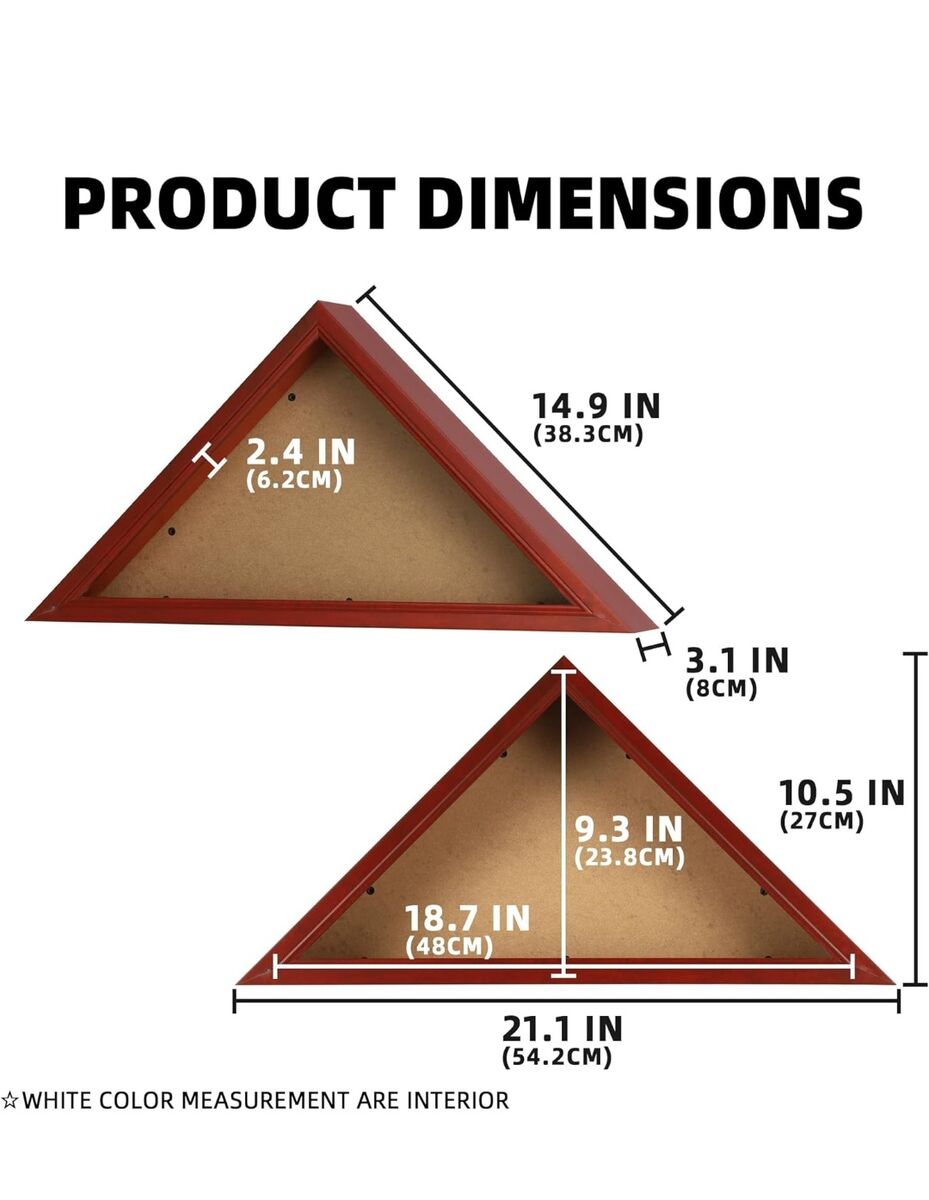 Flag display case / shadow box frame holder for 4'x6' folded flag. Measures 21.1" x 14.9" x 9.3" x 3.1". Acrylic/Polystyrene Holds only the 4' X 6' Flag, please measure you flag and confirm the size before purchase. Exclusively for 4' X 6' Flag, NOT for Funeral/Memorial flag which is 5' x 9'. Dimensions: 22"W X 10.75"H X 3.25"D. Interior: 13" (both sides) X 18" Base X 2"D , from base to top is 9 1/4" No assembly required. Comes in one piece. FLAG NOT INCLUDED! NOTE: This display case will NOT fit a standard 5' x 9' Burial Flag or Casket Draped flag.