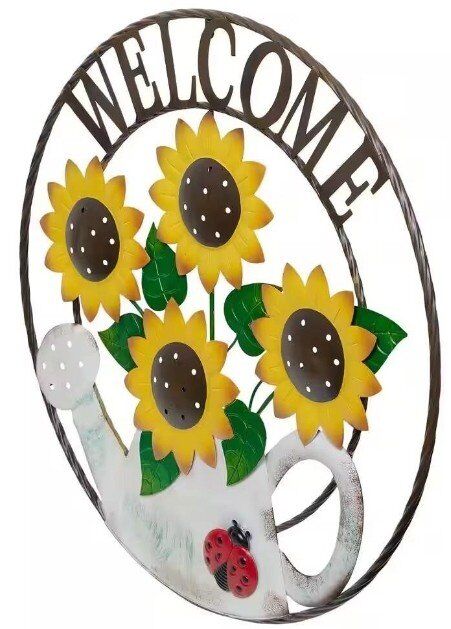 VenmoThe Alpine Corporation Large Round Sunflowers in Gardening Can 'Welcome' Decor is a delightful and inviting addition to your home or garden, with dimensions of 30"L x 2"W x 30"H and crafted from durable iron materials. The large round shape and vibrant sunflower motif make it an eye-catching focal point for any space. Easy to hang and maintain, this decor piece brings a touch of nature-inspired charm to your surroundings.