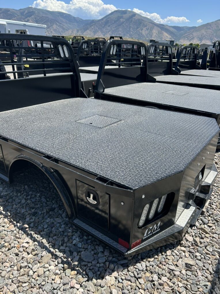 CM Skirted Bed. 7X8.6 Single rear wheel Bed will fit a long bed dodge 4 tool boxes Gooseneck hitch Receiver hitch Powder coated