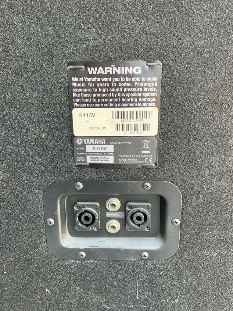 Yamaha S115 2-Way professional speakers. 500 W operating, 1,000 W max. 8 ohm balanced or parallel inputs. Woofer approximately 15”; plus a mid/high horn.