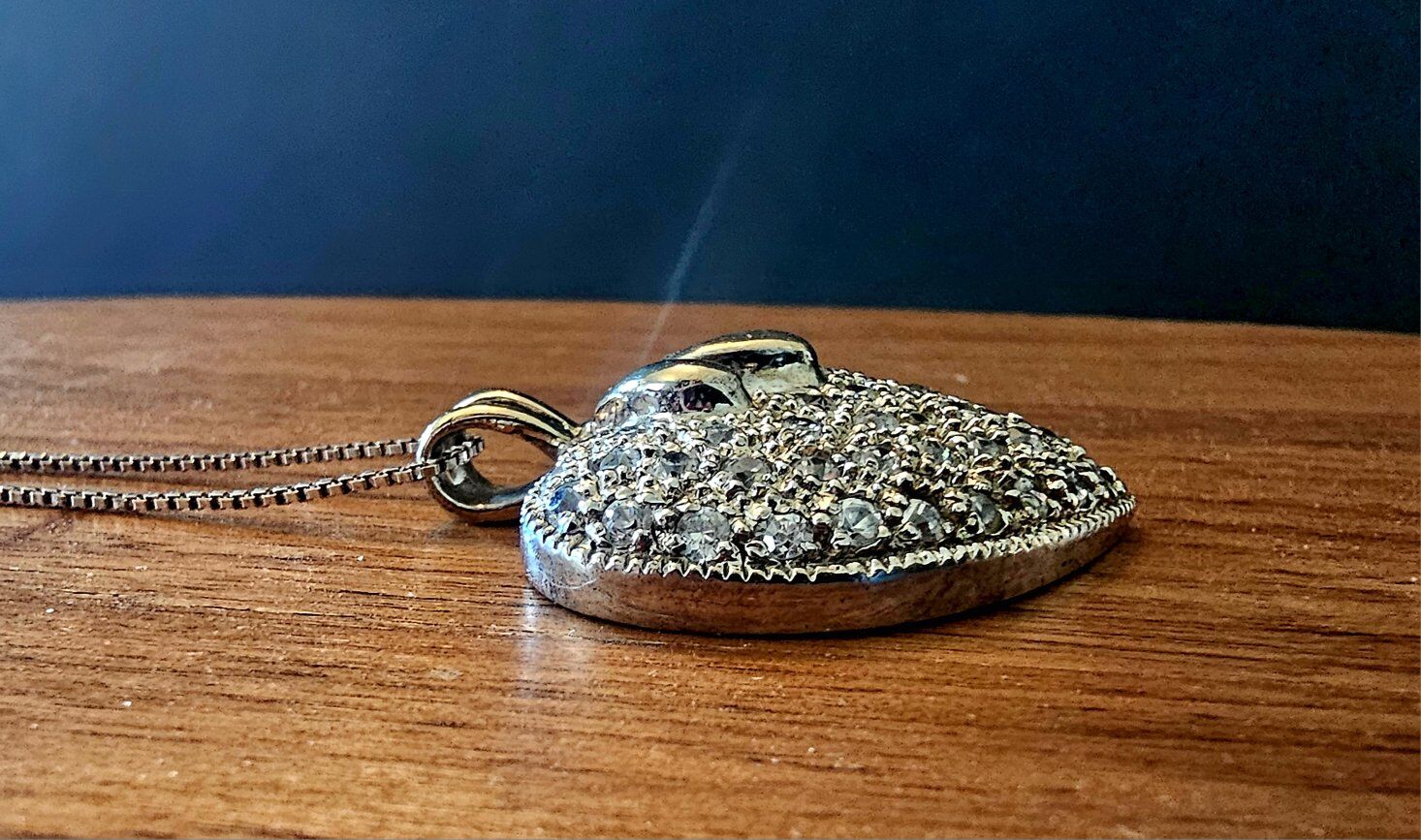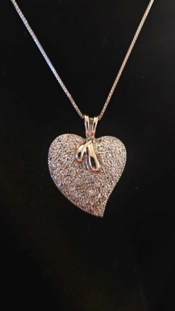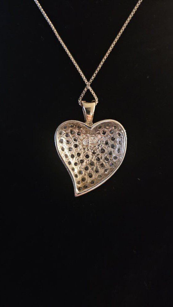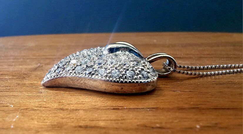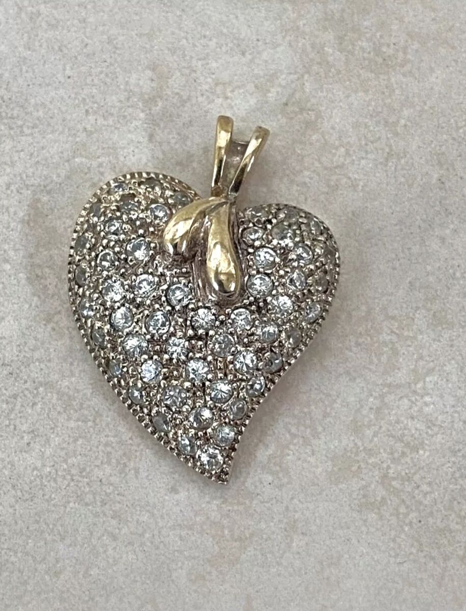 Super pretty feminine vntg heart shaped pendant signed Sterling Silver 925 on the back with shiny round inlaid clear stones accented by a raised gold shaped wishbone.