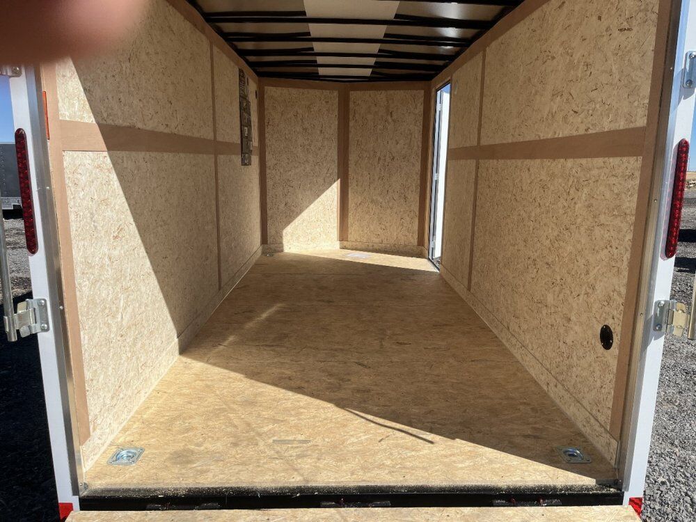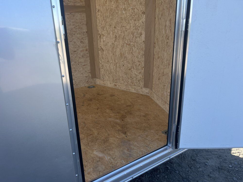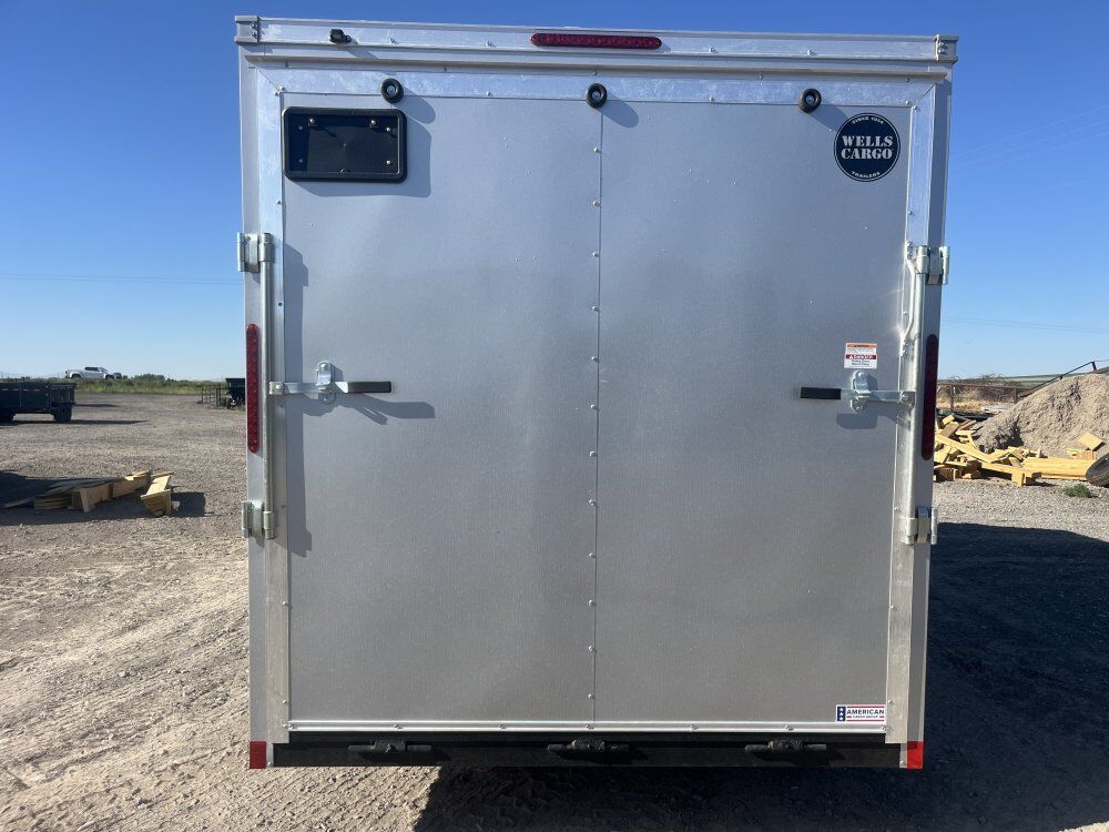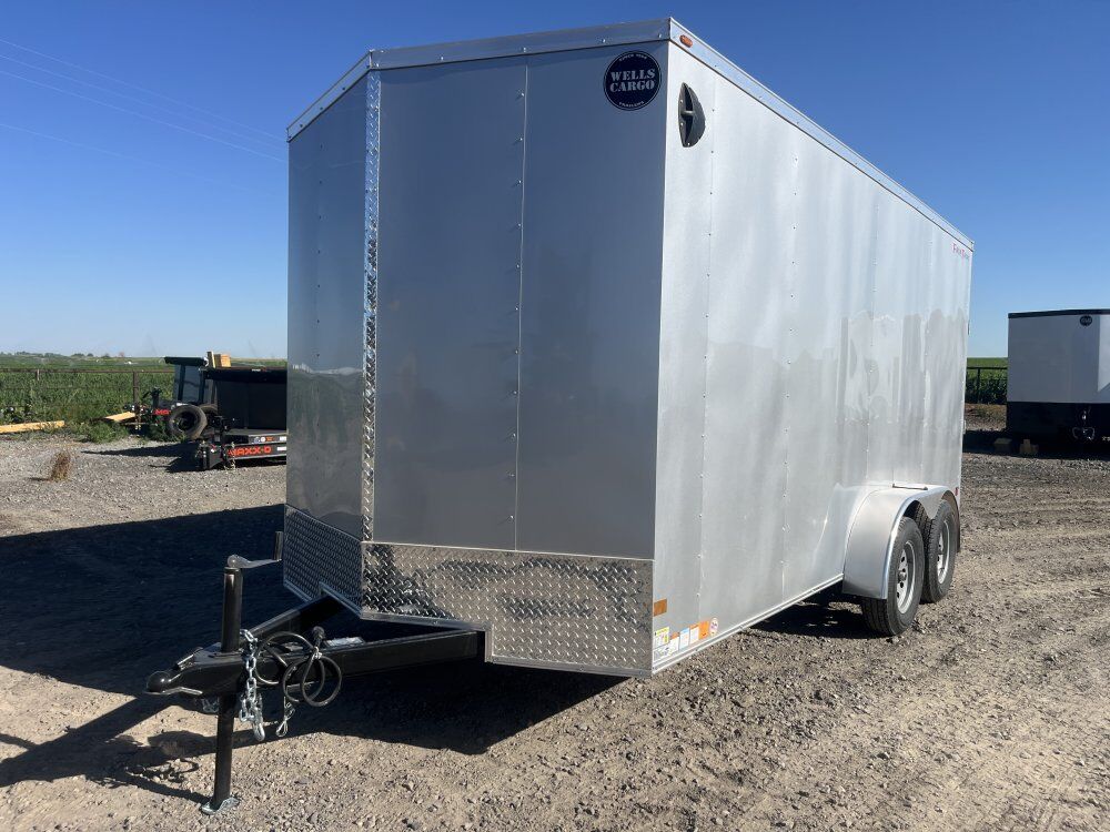 **Wells Cargo 7' x 16' x 7' Tall Cargo Trailer, 7000 LB. GVWR, Sides Screwed only on the Seams, E-Z Lube(r) Hubs 1-Piece Aluminum Roof, 3/4" PlexCore High-Performance Interior Decking, 3/8" PlexCore High-Performance Interior Sidewalls, Rear Ramp Door with Spring Assist, 16" Stoneguard, 4-5000lb Square D Rings, 16" OC Floor Crossmembers, 16" OC Tube Vertical Posts, 24" OC Tube Roof, Interior Light and Switch, 32"x78" RH RV Side Door, .030 Aluminum Exterior Silver, 12v LED Slim Line Tail Lights, 15" Radial Tires, Silver Wheels, LED Clearance Lights